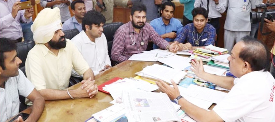 नई दिल्ली। केंद्रीय स्वास्थ्य और परिवार कल्याण मंत्री डॉ हर्षवर्धन ने आज अखिल भारतीय आयुर्विज्ञान संस्थान, सफदरजंग अस्पताल, डॉ राममनोहर अस्पताल के रेजिडेंट डॉक्टरों के एसोसिएशन, यूनाइटेड रेजिडेंट एंड डॉक्टर्स एसोसिएशन ऑफ इंडिया तथा फेडरेशन ऑफ रेजिडेंट डॉक्टर्स एसोसिएशन के शिष्टमंडल से मिले। शिष्टमंडल ने पश्चिम बंगाल में डॉक्टरों के साथ हुई हिंसा की घटनाओं के बारे में डॉ हर्षवर्धन को बताया। डॉ हर्षवर्धन ने गंभीर चिंता व्यक्त करते हुए कहा कि वे डॉक्टरों के साथ होने वाले अभद्र व्यवहार तथा उनपर हमले की घोर निंदा करते हैं और इस बारे में वे पश्चिम बंगाल की मुख्यमंत्री से विचार-विमर्श करेंगे। डॉ हर्षवर्धन ने कहा कि उन्होंने पश्चिम बंगाल की मुख्यमंत्री ममता बनर्जी को लिखे पत्र में आंदोलन को सद्भावपूर्ण रूपसे समाप्त करने और डॉक्टरों को सुरक्षित कामकाजी माहौल सुनिश्चित करने का आग्रह किया है। उन्होंने कहा कि डॉक्टरों की हड़ताल से देशभर में मरीजो को कठिनाई उठानी पड़ रही है और स्वास्थ्य सेवाओं पर प्रतिकूल असर पड़ा है।