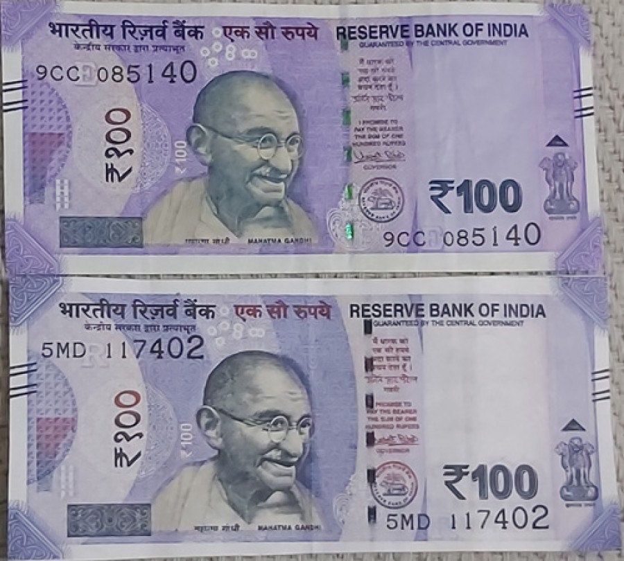 लखनऊ। सावधान! जामुनी रंग का सौ रुपये का नकली नोट भी बाज़ार में उतार दिया गया है। ये जो नोट आप देख रहे हैं इनमें ऊपर वाला सौ रुपये का नोट असली है, जबकि उसके नीचे का जो सौ रुपये का नोट है, वह नकली है। ऊपर वाले सौ रुपये के असली होने की पहचान यह है कि उसके अंदर चौड़ी पट्टी लाइन चमकीली है, जबकि नीचे के नोट में केवल एक पट्टी तो है, मगर वह चमकीली नहीं है। दूसरी पहचान यह है कि ऊपर के असली नोट में गोल आकार में आरबीआई का शेर वाला लोगो इस पट्टी से कुछ दूरी पर है, जबकि नीचे नकली नोट में वह इस पट्टी से सटा हुआ है। एक और पहचान यह है कि असली नोट में नोट का नंबर स्मॉल लेटर में है, जबकि नकली नोट में नोट का नंबर कैपिटल लेटर में है। नकली नोट के बारे में पुलिस को अवश्य सूचित करें।