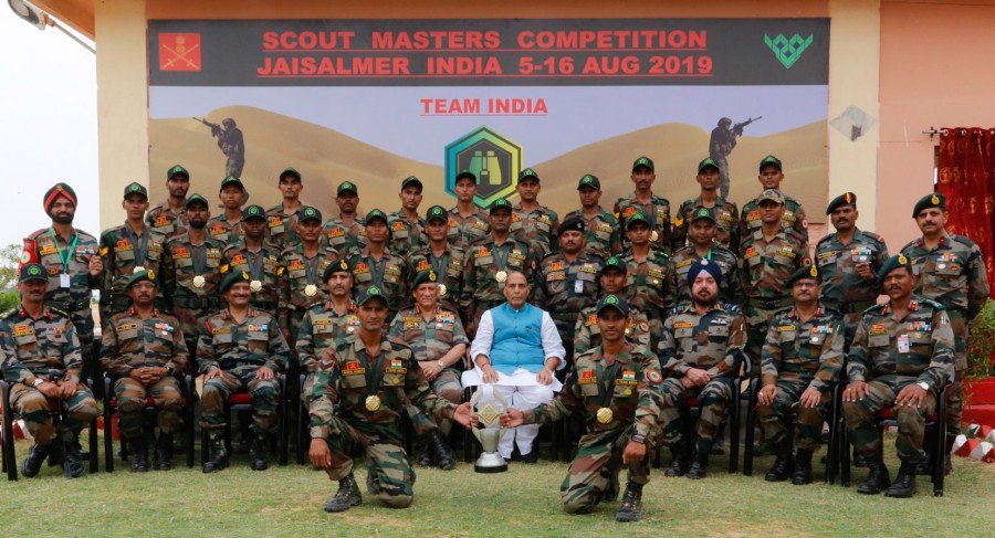 जैसलमेर। रक्षामंत्री राजनाथ सिंह ने जैसलमेर मिलिट्री स्टेशन में 6 से 14 अगस्त 2019 तक हुई 5वीं अंतर्राष्ट्रीय सेना स्काउट्स मास्टर्स प्रतियोगिता- 2019 के विजेताओं को सम्मानित किया। इसमें पहली बार भाग ले रही भारतीय सेना की टीम ने उत्कृष्ट प्रदर्शन किया। प्रतियोगितामें आर्मेनिया, बेलारूस, चीन, कजाकिस्तान, उज्बेकिस्तान, रूस, सूडान और भारत की कुल आठ टीमों ने भाग लिया। विजेताओं को पदक और ट्रॉफी प्रदान करते हुए रक्षामंत्री ने उनके शानदार प्रदर्शन के लिए बधाई दी और सभी आठ टीमों के उज्ज्वल भविष्य की कामना की।