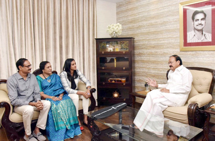हैदराबाद। उपराष्ट्रपति एम वेंकैया नायडू ने कहा है कि पीवी सिंधु राष्ट्र का गौरव है और उसके जैसे खिलाड़ी युवाओं के लिए अनुकरणीय उदाहरण हैं। बीडब्ल्यूएफ विश्व चैम्पियन पीवी सिंधु ने अपने माता-पिता के साथ हैदराबाद में उपराष्ट्रपति से मुलाकात की। बीडब्ल्यूएफ विश्व चैम्पियन प्रतियोगिता में स्वर्ण पदक जीतने वाली पीवी सिंधु पहली भारतीय हैं। उपराष्ट्रपति ने 24 वर्षीय बैडमिंटन स्टार पीवी सिंधु की कड़ी मेहनत, समर्पण और प्रतिबद्धता की सराहना करते हुए कहा कि वह सभी के लिए प्रेरणास्रोत है। वेंकैया नायडू ने अपने लक्ष्य को हासिल करने के लिए पीवी सिंधु के विशुद्ध भोजन लेने और कड़ी अनुशासित प्रैक्टिस की प्रशंसा की।