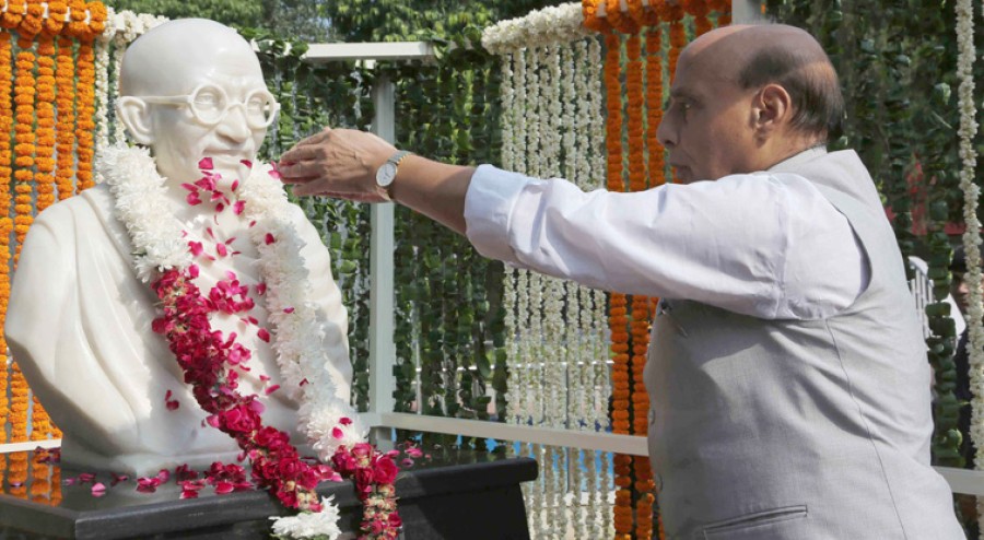 नई दिल्ली। रक्षामंत्री राजनाथ सिंह ने नई दिल्ली छावनी में महात्मा गांधी की प्रतिमा का अनावरण किया और उन्हें श्रद्धांजलि अर्पित की। रक्षामंत्री ने इस अवसर पर राष्ट्रपिता को एक विलक्षण व्यक्ति बताते हुए कहा कि सत्ता में नहीं रहने के बावजूद लोगों के दिलोदिमाग पर उनका व्यापक प्रभाव था। महात्मा गांधी की प्रतिमा उनकी 150वीं जयंती के उपलक्ष्य में रक्षा संपदा निदेशालय ने दिल्ली छावनी के श्रीनागेश गार्डन में लगाई है। रक्षामंत्री ने देश के पूर्व प्रधानमंत्री लालबहादुर शास्त्री को भी उनकी जयंती पर श्रद्धांजलि अर्पित की है। रक्षामंत्री ने कहा कि महात्मा गांधी के राजनीतिक कार्यक्रमों में आम जनता के लिए एक तरह का आर्थिक, सामाजिक और सांस्कृतिक संदेश भी निहित था। चंपारण सत्याग्रह का उल्लेख करते हुए रक्षामंत्री ने कहा कि नील की खेती करने वाले किसानों के हितों के लिए संघर्ष करते समय गांधीजी ने उन लोगों से अपने आस-पास के स्थानों और गांवों को साफ रखने का भी आह्वान किया था, गांधीजी के लिए यह आजादी जितना ही महत्वपूर्ण मुद्दा था।
