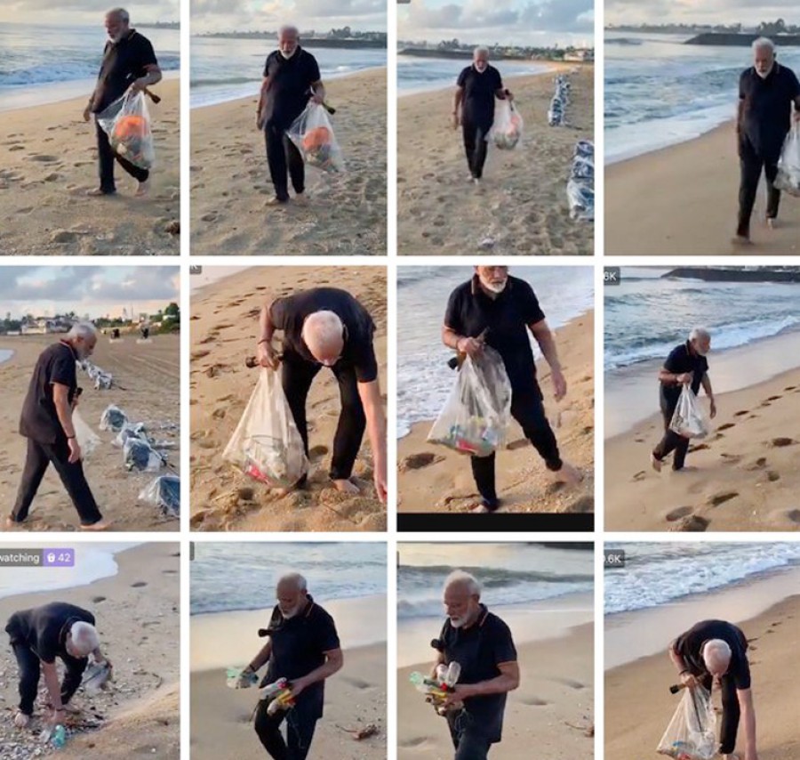 ममल्लापुरम। स्वच्छ भारत के लिए प्रयासरत प्रधानमंत्री नरेंद्र मोदी ने एकबार फिर देश के सामने उदाहरण पेश किया कि प्रत्येक व्यक्ति को अपने आसपास के क्षेत्रों को साफ-सुथरा रखने के लिए प्रयत्नशील रहना चाहिए। ममल्लापुरम के तट पर सुबह की सैर करने निकले प्रधानमंत्री नरेंद्र मोदी ने वहां सफाई अभियान चलाया और 30 मिनट से भी अधिक समय तक वहां बिखरे प्लास्टिक और कचरे को इकट्ठा किया।