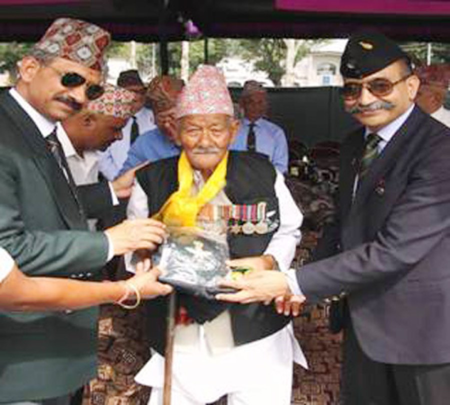 देहरादून। नौवीं गोरखा राइफल्स के सबसे बुजुर्ग हवलदार देवीलाल खत्री संख्या 5832088 (1/9 जीआर और 3/9 जीआर) को लेफ्टिनेंट जनरल एके भट्ट यूआईएसएम, एवीएसएम, एसएम, वीएसएम सैन्य सचिव एवं कर्नल 9वीं गोरखा राइफल्स तथा मेजर जनरल डीए चतुर्वेदी पीवीएसएम, एवीएसएम, एसएम, एडीजी टीए और कर्नल तीसरी गोरखा राइफल्स ने सम्मानित किया। उन्हें यह सम्मान 7 अक्टूबर 2019 को बीरपुर देहरादून में तीसरी और नौवीं गोरखा राइफल्स के बुजुर्ग सैनिकों के लिए आयोजित वार्षिक बाराखाना पर प्रदान किया गया।