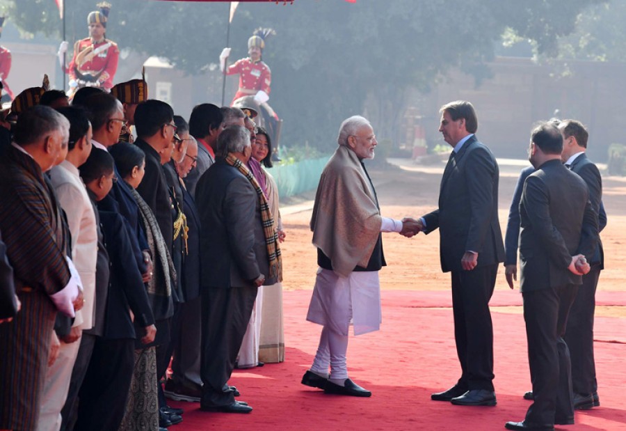 नई दिल्ली। प्रधानमंत्री नरेंद्र मोदी ने राजपथ पर भारत के गणतंत्र दिवस समारोह के मुख्य अतिथि के रूपमें पधारे ब्राजील के राष्ट्रपति जेएर बोल्सोनारो और उनके उच्चस्तरीय प्रतिनिधिमंडल का आज नई दिल्ली में जोरदार स्वागत किया। प्रधानमंत्री नरेंद्र मोदी की ब्राजील के राष्ट्रपति से पिछले आठ महीने में यह तीसरी मुलाकात भी है। प्रधानमंत्री ने कहा कि ब्राजील के राष्ट्रपति का भारत आगमन एवं भारत और ब्राजील के बीच बढ़ती मित्रता दोनों देशों के बीच गहराते संबंधों को दर्शाती है। प्रधानमंत्री ने कहा कि यह भारत के लिए बहुत गर्व की बात है कि वे हमारे 71वें गणतंत्र दिवस पर मुख्य अतिथि हैं और कल राजपथ पर गणतंत्र दिवस की परेड में भारत की विविधता का रंग-बिरंगा और उल्लासपूर्ण स्वरूप देखेंगे। प्रधानमंत्री नरेंद्र मोदी ने कहा कि ब्राजील खुद भी उल्लास से भरे त्योहारों का देश है, एक मित्र के साथ इस विशेष पर्व पर हम अपनी खुशी साझा करेंगे। उन्होंने कहा कि भारत का निमंत्रण स्वीकार करने के लिए मैं उनको धन्यवाद देता हूं। उन्होंने कहा कि यह तीसरा अवसर है, जब ब्राजील के राष्ट्रपति ने यह सम्मान हमें दिया है, उनका आगमन भारत-ब्राजील के बीच मजबूत मित्रता का प्रतीक है।