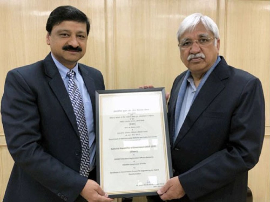 नई दिल्ली। भारत सरकार के प्रशासनिक सुधार और लोक शिकायत विभाग ने वर्ष 2019-20 के संबंध में डिजिटल परिवर्तन की सरकारी प्रक्रिया में उत्कृष्टता के लिए भारत निर्वाचन आयोग को ‘सिल्वर’ पुरस्कार प्रदान किया। यह पुरस्‍कार उन परियोजनाओं के लिए दिया जाता है, जिनमें कार्य प्रणाली का मूल्‍यांकन और उनकी पुनर्रचना शामिल होती है तथा जिनके तहत कुशलता, प्रक्रिया, गुणवत्ता और सेवा क्षेत्र में सुधार किया जाता है। यह पुरस्‍कार 7-8 फरवरी 2020 को मुंबई में ई-प्रशासन पर 23वें राष्‍ट्रीय सम्‍मेलन के दौरान दिया गया। सम्‍मेलन का आयोजन प्रशासनिक सुधार और लोक शिकायत विभाग ने किया था। वरिष्‍ठ उप निर्वाचन आयुक्‍त डॉ संदीप सक्‍सेना और भारत निर्वाचन आयोग संबंधी एरोनेट परियोजना प्रमुख तथा आईसीटी एवं सीआईएसओ निदेशक डॉ कुशाल पाठक ने यह पुरस्‍कार मुख्य चुनाव आयुक्त सुनील अरोड़ा को प्रदान किया।