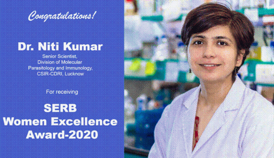 नई दिल्ली। सीएसआईआर-सीडीआरआई लखनऊ के मॉलिक्यूलर पैरासिटोलॉजी एंड इम्यूनोलॉजी प्रभाग की वरिष्ठ वैज्ञानिक डॉ नीति कुमार को एसईआरबी महिला उत्कृष्टता सम्मान-2020 के लिए चुना गया है। उन्हें 28 फरवरी को विज्ञान भवन नई दिल्ली में राष्ट्रीय विज्ञान दिवस समारोह के दौरान राष्ट्रपति रामनाथ कोविंद सम्मानित करेंगे। गौरतलब है कि यह सम्मान 40 वर्ष से कम आयु की महिला वैज्ञानिक को दिया जाता है, जिन्हें विभिन्न राष्ट्रीय अकादमियों से सम्मान प्राप्त हुआ है।