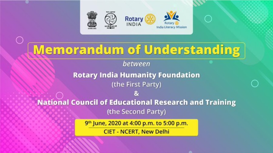 शिक्षा एवं साक्षरता विभाग की सचिव अनिता करवाल ने रोटरी इंडिया ह्यूमेनिटी फाउंडेशन को विभिन्न भाषाओं में कक्षा 1 से 12वीं के विद्यार्थियों को उच्च गुणवत्ता वाली ई-शिक्षण सामग्री उपलब्ध कराने के प्रयासों के लिए धन्यवाद दिया। एनसीईआरटी और रोटरी इंडिया ह्यूमेनिटी फाउंडेशन के बीच समझौता ज्ञापन पर एनसीईआरटी के निदेशक प्रोफेसर हृषिकेश सेनापति और एनसीईआरटी के संयुक्त निदेशक प्रोफेसर अमरेंद्र बेहरा और रोटरी इंडिया की ओर से निदेशक रोटरी इंडिया वाटर मिशन रंजन ढींगरा ने हस्ताक्षर किए। रोटरी इंटरनेशनल के निदेशक 2019-21 कमल संघवी ने इस टाईअप के बारे में विस्तृत जानकारी दी, जिसमें शामिल हैं-एनसीईआरटी टीवी टाईअप। एनसीईआरटी के बारह राष्ट्रीय टेलीविजन चैनलों के माध्यम से कक्षा 1-12 के लिए पाठ्यक्रम मॉड्यूल का प्रसारण किया जाएगा, जो जुलाई 2020 से उपलब्ध होगा। एनसीईआरटी उनके पाठ्यक्रम के अनुसार पाठ्य सामाग्रियों को परखेगा। दीक्षा ऐप टाईअप एक ही समय में भारत सरकार के राष्ट्रीय मोबाइल ऐप, दीक्षा के माध्यम से ई-लर्निंग मॉड्यूल भी उपलब्ध होंगे।
