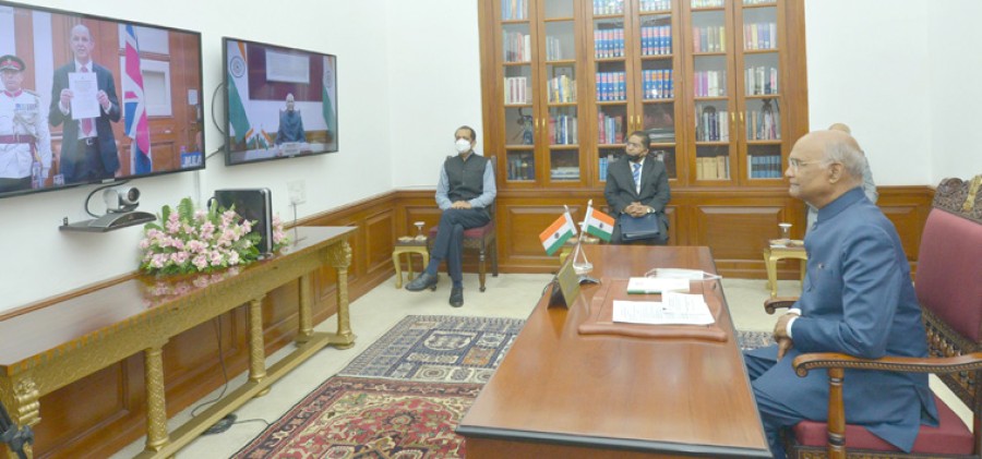 नई दिल्ली। राष्ट्रपति रामनाथ कोविंद से न्यूज़ीलैंड, यूनाइटेड किंगडम यानी ब्रिटेन और उज्बेकिस्तान के नए मिशन प्रमुखों ने भेंट करते हुए उन्हें अपना परिचय दिया। ऐसा दूसरी बार हुआ है जब कोविड-19 महामारी के चलते राष्ट्रपति भवन में वीडियो कॉंफ्रेंस के माध्यम से परिचय पत्र स्वीकार किए गए हैं। अपना परिचय प्रस्तुत करने वाले हेड ऑफ मिशन इस प्रकार हैं-न्यूज़ीलैंड के उच्चायुक्त डेविड पाइन, यूनाइटेड किंगडम के उच्चायुक्त सर फिलिप बार्टन और उज्बेकिस्तान गणराज्य के राजदूत अखातोव दिलशोद खामीदोविच। राष्ट्रपति रामनाथ कोविंद ने इस अवसर पर राजदूतों को उनकी नियुक्ति पर शुभकामनाएं दीं।