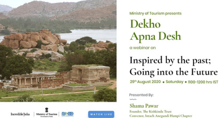विजयनगर (कर्नाटक)। केंद्रीय पर्यटन मंत्रालय ने देखो अपना देश वेबिनार श्रृंखला में शीर्षक 'हम्पी-अतीत से प्रेरित, भविष्य की ओर अग्रसर' वेबिनार का आयोजन किया, जो एकीकृत दृष्टिकोण पर केंद्रित था, जो हम्पी की आवश्यकताओं को विरासत स्थल और पर्यटन स्थल दोनों रूपों में संबोधित करने पर आधारित था और इसकी सामाजिक, आर्थिक और पारिस्थितिक चिंताओं को भी संबोधित करने वाला था। वेबिनार को शमा पवार संस्थापक किष्किंधा ट्रस्ट और संयोजक इंटेक अनेगुंडी हम्पी ने प्रस्तुत किया, जिसमें हम्पी के भव्य स्थलों का प्रदर्शन किया गया, जोकि विजयनगर साम्राज्य के अंतिम महान हिंदू साम्राज्य की अंतिम राजधानी थी। यूनेस्को की विश्व धरोहर स्थल हम्पी की शानदार अवस्थिति में तुंगभद्रा नदी वर्धमान पहाड़ी की श्रृंखलाएं और खुले मैदानों वाले भौगोलिक क्षेत्र हैं। इस साम्राज्य के विभिन्न शहरी, शाही और पवित्र प्रणालियों की विशेषज्ञताएं, 1600 से ज्याद बचे हुए अवशेषों के माध्यम से स्पष्ट होते हैं, जिसमें किले, नदी तट की विशेषताएं, शाही और पवित्र परिसर, मंदिर, धार्मिक स्थल, खंभे वाले हॉल, मंडप, स्मारक संरचनाएं, प्रवेश द्वार, रक्षा चौकियां, अस्तबल, जल संरचनाएं आदि शामिल हैं।