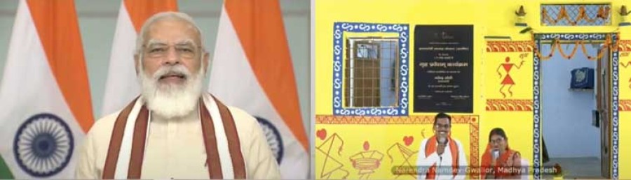 भोपाल। प्रधानमंत्री नरेंद्र मोदी ने आज वीडियो कॉंफ्रेंसिंग से मध्य प्रदेश में गृह प्रवेश कार्यक्रम में 1 लाख 75 हजार परिवारों को प्रधानमंत्री आवास योजना-ग्रामीण के अंतर्गत निर्मित पक्के घर सौंपे। प्रधानमंत्री ने इस अवसर पर कहा कि आज जिन 1.75 लाख परिवारों को नए मकान मिले हैं, उनका अपने घर का सपना साकार हुआ है और अपने बच्चों के भविष्य को लेकर आत्मविश्वास पैदा हुआ है। प्रधानमंत्री ने कहा कि ये परिवार भी अब उन दो करोड़ 25 लाख परिवारों में सम्मिलित हो गए हैं जिन्हें बीते 6 वर्ष में सरकार ने उनको अपने घर दिए हैं और ये परिवार अब किराए के मकान, झुग्गी या कच्चे घरों में नहीं, बल्कि अपने पक्के घरों में रहेंगे। प्रधानमंत्री ने लाभार्थियों को दिवाली की शुभकामनाएं दीं और कहा कि अगर कोरोना महामारी के हालात न होते तो उनके इस आनंद उत्सव को साझा करने के लिए वह स्वयं उनके बीच होते।