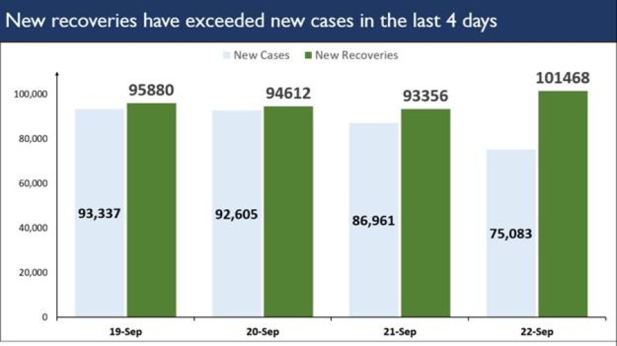 नई दिल्ली। भारत की कोरोना के खिलाफ जंग में आज अभूतपूर्व सफलता सामने आई है। भारत में आज एक दिन में सबसे अधिक मरीज़ों के स्वस्थ होने का रिकॉर्ड बना है। देश में पिछले 24 घंटे में 1 लाख (1,01,468) रोगी ठीक हुए हैं। भारत में पिछले चार दिन से मरीज़ों के स्वस्थ होने की संख्या में लगातार वृद्धि हो रही है, इसके साथ ही कोविड संक्रमण से मुक्त होने वालों की कुल संख्या लगभग 45 लाख (44,97,867) हो गई है, जिसके परिणामस्वरूप देश में मरीज़ों के ठीक होने की दर 80.86 प्रतिशत तक पहुंच गई है। ठीक होने वाले नए मामलों में से 79 प्रतिशत मामले दस राज्यों और केंद्रशासित प्रदेशों से हैं और ये राज्य हैं-महाराष्ट्र, कर्नाटक, आंध्रप्रदेश, उत्तर प्रदेश, तमिलनाडु, ओडिशा, दिल्ली, केरल, पश्चिम बंगाल और पंजाब।