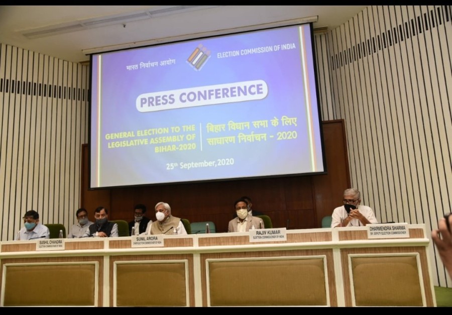 नई दिल्ली/ पटना। भारत के मुख्य चुनाव आयुक्त सुनील अरोड़ा ने आज प्रेस कॉंफ्रेंस में भारत में कोरोनाकाल में बिहार में पहले विधानसभा चुनाव की घोषणा कर दी है। बिहार चुनाव तीन चरण में होंगे। पहला चरण 28 अक्टूबर, दूसरा चरण 3 नवंबर, तीसरा चरण 7 नवंबर को होगा और दीपावली से चार दिन पूर्व यानी 10 नवंबर को बिहार के चुनाव परिणाम आ जाएंगे। मुख्य चुनाव आयुक्त ने बताया कि बिहार चुनाव कोरोना सुरक्षा मानकों के अनुसार ही होंगे। उन्होंने बताया कि चुनाव प्रचार सिर्फ वर्चुअल होगा, चुनाव प्रचार ऑनलाइन होगा, नामांकन भी ऑनलाइन होगा, पहले जैसी चुनाव सभाएं नहीं होंगी, दो गज की दूरी से चुनाव प्रचार होगा, पांच से ज्यादा लोग किसी के घर जाकर प्रचार नहीं करेंगे, सभी मास्क लगाएंगे, पीपीई किट और फेस शील्ड का इस्तेमाल होगा, कोरोना के मरीज भी मतदान के अंतिम समय वोट दे सकेंगे। उन्होंने बताया कि इस बार मतदान का समय एक घंटा बढ़ा दिया गया है और प्रत्येक राजनीतिक दल को या निर्दलीय प्रत्याशी को अपने आपराधिक रिकार्ड की जानकारी मीडिया के माध्यम से सार्वजनिक करनी होगी।