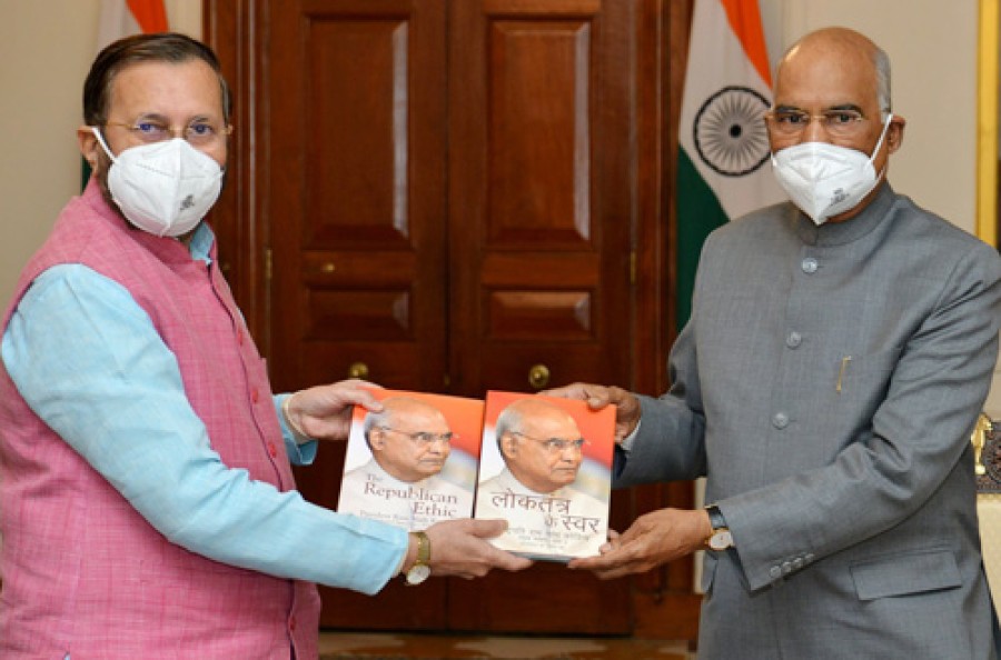 नई दिल्ली। केंद्रीय सूचना एवं प्रसारण मंत्री प्रकाश जावड़ेकर ने दो ई-बुक्स 'द रिपब्लिकन एथिक वॉल्यूम-III' और 'लोकतंत्र के स्वर' का अनावरण किया। प्रकाश जावड़ेकर ने राष्ट्रपति भवन जाकर राष्ट्रपति रामनाथ कोविंद को इनकी प्रतियां भी भेंट कीं। उन्होंने पुस्तक लोकार्पण पर बताया कि राष्ट्रपति रामनाथ कोविंद ने विभिन्न अवसरों विभिन्न विषयों पर कई प्रेरणादायक भाषण दिए हैं, इन पुस्तकों में भारत के आत्मविश्वास की झलक मिलती है, इसमें राष्ट्रपति के उन भाषणों को प्रकाशित किया गया है, जो भारत की कोरोना के विरुद्ध लड़ाई के दौरान दिए गए हैं। प्रकाश जावड़ेकर ने कहा कि इस जानलेवा संक्रमण के विरुद्ध भारत ने अन्य राष्ट्रों की तुलना में अपनी सीमाओं को प्रभावी तरीके से सुरक्षित किया है और ये पुस्तकें उन तमाम प्रयासों को चिन्हित करती हैं।