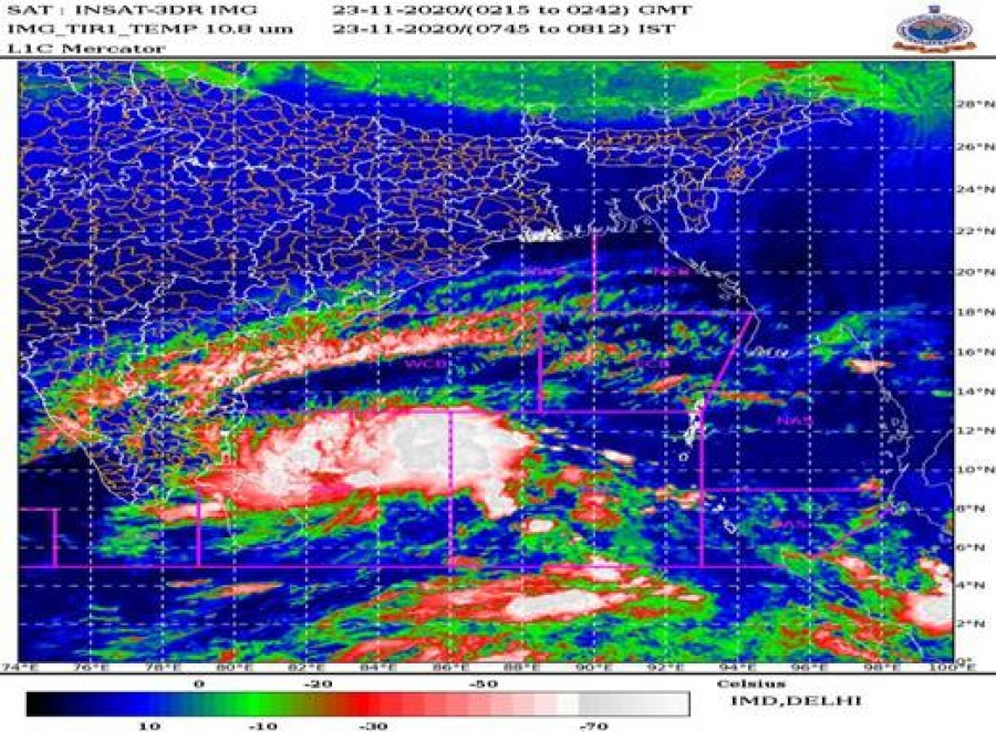 नई दिल्ली/ चैन्नई। चक्रवात चेतावनी प्रभाग राष्ट्रीय मौसम पूर्वानुमान केंद्र क्षेत्रीय मौसम विज्ञान केंद्र और नई दिल्ली स्थित भारतीय मौसम विभाग ने चेतावनी दी है कि दक्षिण-पश्चिम में और बंगाल की खाड़ी से सटे दक्षिण-पूर्वी क्षेत्र में बना मौसम का दबाव उत्तर-पश्चिम की ओर बढ़ गया है और पुदुचेरी से दक्षिण, दक्षिण-पूर्व में लगभग 600 किलोमीटर और चेन्नई के दक्षिण-दक्षिण-पूर्व में 630 किलोमीटर दूरी पर स्थित हो गया है। इसके अगले 24 घंटे में चक्रवाती तूफान में बदलने की संभावना है। इसके 25 नवंबर की दोपहर के आसपास उत्तर-पश्चिम दिशा की ओर बढ़ने और तमिलनाडु और पुदुचेरी के तटों के बीच कराइकल और मल्लापुरम को पार कर जाने की संभावना है।