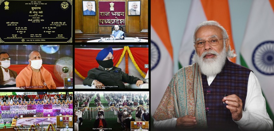 प्रधानमंत्री नरेंद्र मोदी ने वर्चुअल माध्यम से आगरा के मेट्रो प्रोजेक्ट को शुरु करते हुए कहा कि बीते छह साल में यूपी के साथ ही पूरे देश में जिस स्पीड और स्केल पर मेट्रो नेटवर्क पर काम हुआ है, वही सरकार की पहचान और प्रतिबद्धता दोनों को दर्शाता है। उन्होंने कहा कि 2014 तक देश में लगभग 215 किलोमीटर मेट्रो लाईन ऑपरेशनल हुई थीं, उसके बाद के 6 वर्ष में देश में 450 किलोमीटर से ज्यादा मेट्रो लाईन देशभर में ऑपरेशनल है और लगभग 1000 मेट्रो लाईन पर तेज गति से काम भी चल रहा है, इस प्रकार आज देश के 27 शहरों में मेट्रो का काम या तो पूरा हो चुका है या फिर काम अलग-अलग चरणो में है। प्रधानमंत्री ने कहा कि यूपी की ही बात करें तो आगरा मेट्रो सुविधा से जुड़ने वाला ये यूपी का सातवां शहर है और इनके बीच एक और बात बहुत विशेष है, वह यह है कि देश में सिर्फ मेट्रो रेल नेटवर्क ही नही बन रहे हैं, बल्कि मेक इन इंडिया के तहत आज मेट्रो कोच भी भारत में ही बन रहे हैं। उन्होंने कहा कि यही नहीं जो सिग्लन सिस्टम है उसका भी पूरी तरह से भारत में ही निर्माण हो, इस पर भी काम चल रहा है, यानि अब मेट्रो नेटवर्क के मामले में भी भारत आत्मनिर्भर हो रहा है।