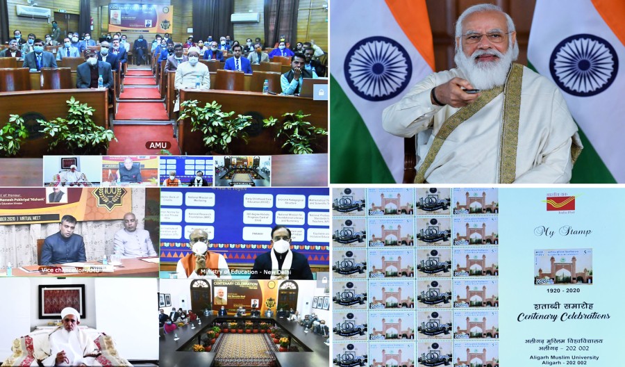 अलीगढ़/ नई दिल्ली। प्रधानमंत्री नरेंद्र मोदी ने आज अलीगढ़ मुस्लिम विश्वविद्यालय के शताब्दी समारोह को संबोधित करते हुए कोरोना महामारी के दौरान अलीगढ़ मुस्लिम विश्वविद्यालय के योगदान की सराहना की। उन्होंने कहा कि नए भारत के विजन में यह कल्पना की गई है कि देश और समाज के विकास को राजनीतिक दृष्टि से नहीं देखा जाना चाहिए, देश के संसाधन हर नागरिक के लिए हैं, इनका सभी को लाभ मिलना चाहिए और किसी भी व्यक्ति को धर्म के कारण पीछे नहीं छोड़ा जाएगा। उन्होंने अलीगढ़ मुस्लिम विश्वविद्यालय के शताब्दी समारोह को वीडियो कॉंफ्रेंस के माध्यम से संबोधित किया और समारोह की याद में एक डाक टिकट भी जारी किया। इस अवसर पर प्रधानमंत्री ने सर सैय्यद की उस टिप्पणी को याद किया कि अपने देश के बारे में जो व्यक्ति चिंता करता है, उसका पहला और सबसे महत्वपूर्ण कर्तव्य यह है कि वह जाति, पंथ या धर्म का विचार किए बिना सभी लोगों के कल्याण के लिए काम करे।
