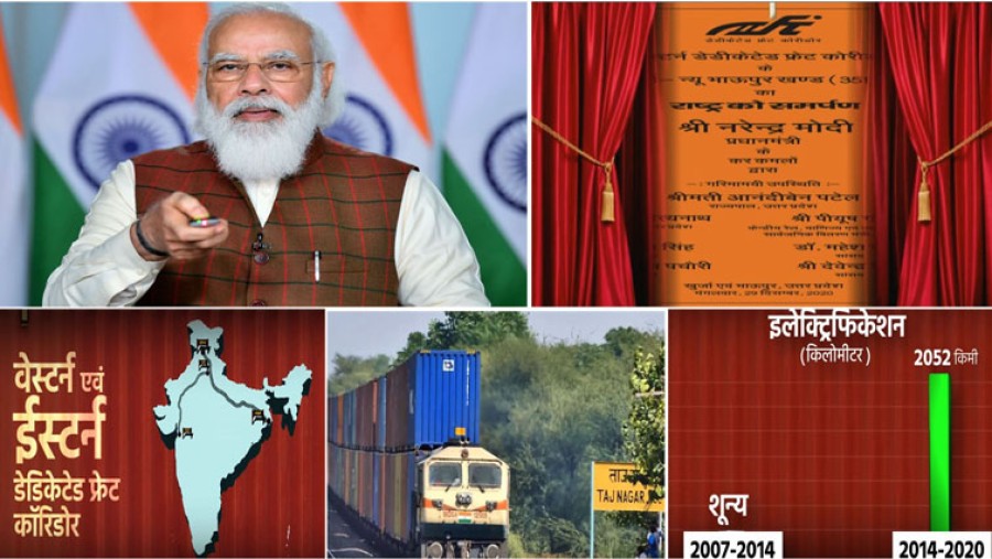 प्रधानमंत्री ने कहा कि वर्ष 2014 तक एक किलोमीटर भी पटरी नहीं बिछायी जा सकी थी, किंतु देश में भाजपा सरकार के गठन के बाद निरंतर निगरानी और हितधारकों के साथ बैठक के परिणामस्वरूप लगभग 1100 किलोमीटर का काम अगले कुछ महीनों में पूरा हो गया है। उन्होंने पिछले शासन की मानसिकता की आलोचना की, जिसने पटरियों को बढ़ाने के बजाय रेलगाड़ियों की संख्या बढ़ाने पर ध्यान केंद्रित किया था, इस दौरान रेल नेटवर्क के आधुनिकीकरण पर ज्यादा निवेश नहीं किया गया। उन्होंने कहा कि अलग रेल बजट के उन्मूलन के साथ इसमें बदलाव किया गया था और रेल ट्रैक पर निवेश किया गया था। उन्होंने कहा कि सरकार ने रेल नेटवर्क के चौड़ीकरण तथा विद्युतीकरण एवं मानव-रहित रेल क्रॉसिंग को खत्म करने पर ध्यान केंद्रित किया। प्रधानमंत्री ने कहा कि रेलवे में हर स्तर पर सुधार किए गए हैं जैसे-स्वच्छता, बेहतर भोजन, पेय एवं अन्य सुविधाएं। उन्होंने कहा कि इसी प्रकार रेलवे से संबंधित विनिर्माण के क्षेत्र में आत्मनिर्भरता पाना एक बड़ी उपलब्धि है।