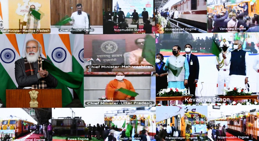 नई दिल्ली। प्रधानमंत्री नरेंद्र मोदी ने केवड़िया के लिए विभिन्न स्थानों से 8 नई ट्रेनों को हरी झंडी दिखाकर रवाना किया और रेखांकित किया कि हाल के वर्षों में रेलवे के बुनियादी ढांचा विकास के दृष्टिकोण में उल्लेखनीय बदलाव आया है इस बदलाव के चलते भारतीय रेलवे के आधुनिकीकरण में अभूतपूर्व प्रगति हुई है। प्रधानमंत्री नरेंद्र मोदी गुजरात के केवड़िया को देश के विभिन्न भागों से जोड़ने के लिए 8 रेलगाड़ियों को शुरू किए जाने के अवसर पर बोल रहे थे। वीडियो कॉन्फ्रेंस के माध्यम से आयोजित इस कार्यक्रम में उन्होंने गुजरात में रेलवे की कई अन्य परियोजनाओं का भी उद्घाटन किया।