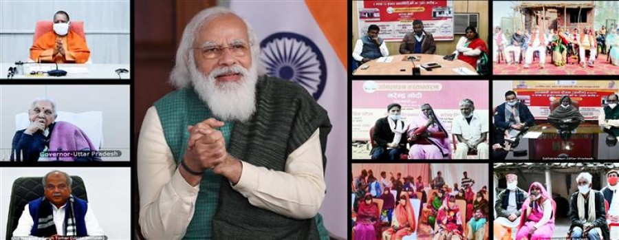 प्रधानमंत्री ने कहा कि इससे ग्रामीणों के जीवनस्तर में सुधार हुआ है। उन्होंने आयुष्मान भारत योजना, राष्ट्रीय पोषण मिशन, उजाला योजना जैसे जीवन को सुगम बनाने के लिए विभिन्न पहलों को सूचीबद्ध किया, जिसने उत्तर प्रदेश को एक नई पहचान दी है। उन्होंने एक्सप्रेसवे और अखिल भारतीय आयुर्विग्यान संस्थान-एम्स जैसी बुनियादी ढांचागत परियोजनाओं को सूचीबद्ध करते हुए कहा कि इससे उत्तर प्रदेश में विकास की गति को तेज करने में मदद मिलेगी। उन्होंने कहा कि आज उत्तर प्रदेश में कई बड़ी कंपनियां निवेश के लिए आ रही हैं, 'वन डिस्ट्रिक्ट वन प्रोडक्ट' यानी एक जनपद, एक उत्पाद के जरिए छोटी कंपनियों के लिए भी रास्ते खुले हैं, जहां स्थानीय कारीगर लाभांवित हो रहे हैं। उत्तर प्रदेश की राज्यपाल आनंदीबेन पटेल, मुख्यमंत्री योगी आदित्यनाथ और केंद्रीय ग्रामीण विकास मंत्री नरेंद्र सिंह तोमर भी कॉंफ्रेंसिंग से कार्यक्रम से जुड़े।