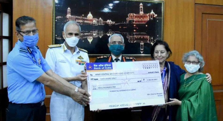 नई दिल्ली। भारतीय सेना पूर्व सैनिक निदेशालय और नौसेना उप प्रमुख रहे वाइस एडमिरल केके नैय्यर की पत्नी वीणा नैय्यर ने सेना, नौसेना और वायुसेना की संचालित कल्याणकारी योजनाओं के लिए दो करोड़ रुपये की शपथ के प्रावधान वाले एक समझौता ज्ञापन पर हस्ताक्षर किए हैं। वीना नैय्यर ने सेना के तीन अंगों को दो करोड़ रुपये का चेक भेंट किया, जिसे नौसेना प्रमुख एडमिरल करमबीर सिंह, सेना प्रमुख जनरल एमएम नरवणे और एयर ऑफिसर इंचार्ज प्रशासन एयर मार्शल वीपी एस राणा ने सेना मुख्यालय नई दिल्ली में प्राप्त किया।