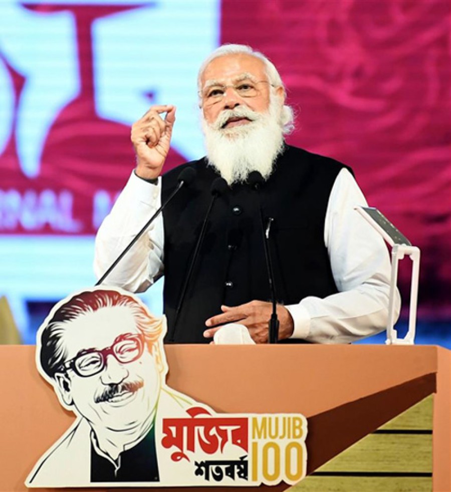 प्रधानमंत्री नरेंद्र मोदी ने कहा कि भारत और बांग्लादेश दोनों ही देशों की सरकारें इस संवेदनशीलता को समझकर इस दिशा में सार्थक प्रयास कर रही हैं, हमने दिखा दिया है कि आपसी विश्वास और सहयोग से हर एक समाधान हो सकता है, हमारा भूमि सीमा समझौता भी इसी का गवाह है, कोरोना के इस कालखंड में दोनों देशों के बीच बेहतरीन तालमेल रहा है। उन्होंने कहा कि हमने सार्क कोविड फंड की स्थापना में सहयोग किया, अपने ह्यूमन रिसोर्स की ट्रेनिंग में सहयोग किया और भारत को इस बात की बहुत खुशी है कि मेड इन इंडिया की वैक्सीन बांग्लादेश के हमारे बहनों और भाइयों के काम आ रही हैं। उन्होंने भारत के गणतंत्र दिवस पर 26 जनवरी की वो तस्वीरें याद कीं जब बांग्लादेश सशस्त्र बलों की त्रि-सेवा टुकड़ी ने शोनो एक्टि मुजीबोरेर थेके की धुन पर परेड की थी। उन्होंने कहा कि भारत-बांग्लादेश के संबंधों को मजबूत करने के लिए दोनों ही देशों के युवाओं में बेहतर जुड़ाव भी उतना ही आवश्यक है और भारत-बांग्लादेश संबंधों के 50 वर्ष पर बांग्लादेश के 50 उद्यमियों को भारत आने के लिए आमंत्रित किया। उन्होंने कहा कि भारत आएं हमारे स्टार्ट-अप और इनोवेशन इको-सिस्टम से जुड़ें, उद्यम पूंजीपतियों से मुलाकात करें। उन्होंने बांग्लादेश के युवाओं के लिए शुबर्नौ जॉयंती छात्रवृत्ति की घोषणा भी की।