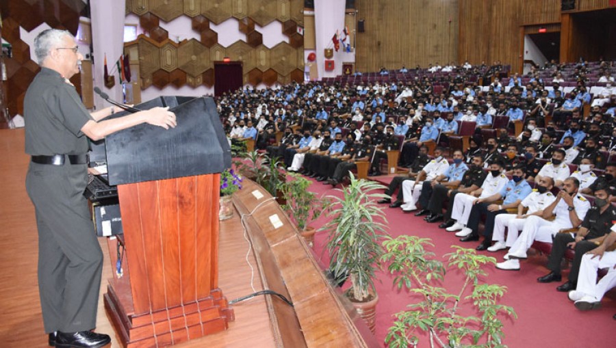 वेलिंगटन (तमिलनाडु)। सेना प्रमुख जनरल मनोज मुकुंद नरवणे ने तमिलनाडु में रक्षा डिफेंस सर्विसेज स्टाफ कॉलेज वेलिंगटन में 76वें स्टाफ कोर्स में भाग लेने वाले संकाय और अधिकारियों को 'पश्चिमी और उत्तरी सीमाओं पर हुई घटनाएं एवं भारतीय सेना के भविष्य के रोडमैप पर उनका प्रभाव' विषय पर एक व्याख्यान दिया। उन्होंने कहा कि राष्ट्र अपनी सीमाओं पर नए सिरे से चुनौतियों का सामना कर रहा है। उन्होंने छात्रों को सभी घटनाक्रमों से अवगत रहने की जरूरत का आह्वान किया।