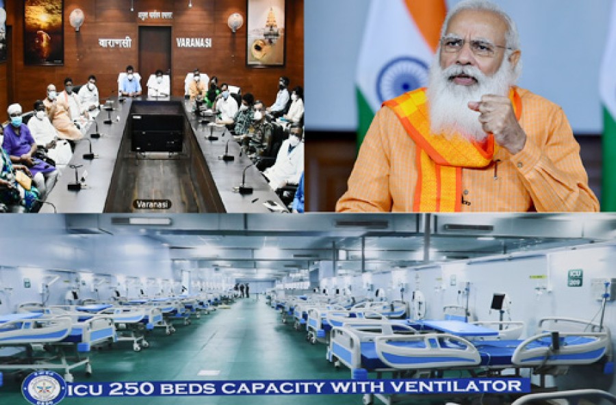 प्रधानमंत्री नरेंद्र मोदी ने काशी के डॉक्टरों, नर्सों, तकनीशियनों, वार्डब्वाय, एंबुलेंस चालकों और अग्रिम पंक्ति के स्वास्थ्य कर्मचारियों के कार्यों के लिए उनकी प्रशंसा की। उन्होंने अपने प्रियजनों को खोने वाले सभी लोगों को श्रद्धांजलि दी। उन्होंने बनारस में कम समय में तेजी से ऑक्सीजन और आईसीयू बेड की संख्या बढ़ाने और बहुत कम समय में पंडित राजन मिश्रा कोविड अस्पताल को सक्रिय करने की प्रशंसा की। उन्होंने प्रसन्नता व्यक्त की कि वाराणसी में एकीकृत कोविड कमान प्रणाली ने बहुत अच्छा काम किया और कहा कि वाराणसी का उदाहरण दुनिया को प्रेरित करता है। प्रधानमंत्री ने बनारस और पूर्वांचल के ग्रामीण क्षेत्रों पर ध्यान केंद्रित करके लंबी लड़ाई लड़ने का आग्रह किया। उन्होंने कहा कि पिछले कुछ वर्ष में जो योजनाएं बनीं हैं और जो अभियान चलाए गए हैं, उनसे कोरोना से लड़ने में काफी मदद मिली है। उन्होंने कहा कि स्वच्छ भारत अभियान के तहत बनाए गए शौचालय, आयुष्मान भारत योजना के अंतर्गत नि:शुल्क इलाज की सुविधा, उज्ज्वला योजना के तहत गैस सिलेंडर, जनधन बैंक खाता या फिट इंडिया अभियान, योग और आयुष के प्रति जागरुकता जैसे कदमों से कोरोना के खिलाफ लड़ाई में लोगों की शक्ति में वृद्धि हुई है।