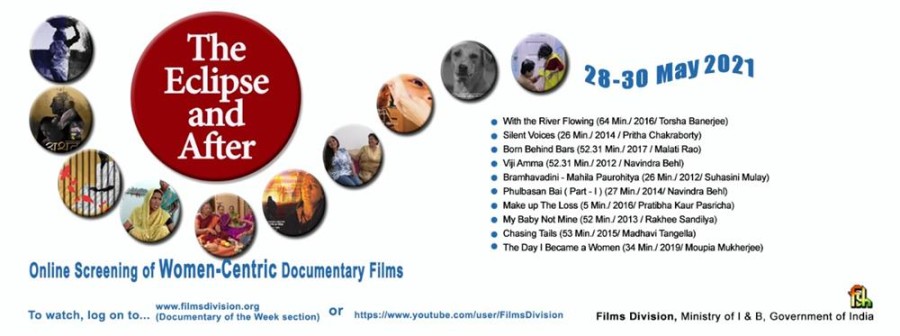 'द एक्लिप्स एंड आफ्टर' में शामिल फिल्में हैं-विद द रिवर फ्लोइंग (64 मिनट/तोर्शो बनर्जी), साइलेंट वॉयसेज़ (26 मिनट/पृथा चक्रवर्ती), बॉर्न बिहाइंड बार्स (52 मिनट/ मालती राव), विजी अम्मा (53 मिनट/नवनिंद्र बहल), ब्रम्हवादिनी-महिला पौरोहित्य (26 मिनट/सुहासिनी मुले), फूलबसन बाई (27 मिनट/नवनिंद्र बहल), मेकअप द लॉस (5 मिनट/प्रतिभा कौर पसरीचा), माई बेबी नॉट माइन (52 मिनट/राखी शंडिल्य), चेसिंग टेल्स (53 मिनट/माधवी तंगेला) और द डे आई बिकेम अ वुमन (34 मिनट/मौपिया मुखर्जी)। ये फिल्में https://filmsdivision.org/ पर डॉक्यूमेंट्री ऑफ द वीक में और https://www.youtube.com/user/FilmsDivision पर 28 से 30 मई 2021 के बीच निःशुल्क स्ट्रीम की जाएंगी।