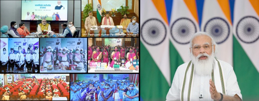 प्रधानमंत्री ने कहा कि सरकार मेड इन इंडिया खिलौनों को भी बढ़ावा दे रही है खासतौर से आदिवासी क्षेत्रों की बहनें इस हुनर से परंपरागत रूपसे जुड़ी हैं, इस क्षेत्र में भी स्वयं सहायता समूहों केलिए काफी संभावनाएं हैं। प्रधानमंत्री ने कहा कि देश को सिंगल यूज प्लास्टिक से मुक्त करने केलिए अभियान जारी है, इसमें स्वयं सहायता समूहों की दोहरी भूमिका है। उन्होंने सिंगल यूज प्लास्टिक के उपयोग के बारे में जागरुकता बढ़ाने और इसके विकल्प केलिए काम करने का आग्रह किया। उन्होंने स्वयं सहायता समूहों से ऑनलाइन सरकारी ई-मार्केटप्लेस का पूरा लाभ उठाने का आग्रह किया। उन्होंने कहा कि देश में न सिर्फ महिलाओं का सम्मान बढ़ा है, बल्कि बेटियों-बहनों का भी आत्मविश्वास बढ़ा है। प्रधानमंत्री ने स्वयं सहायता समूहों से राष्ट्र निर्माण के प्रयासों को अमृत महोत्सव से भी जोड़ने का आग्रह किया। उन्होंने स्वयं सहायता समूहों की महिलाओं से कहा कि वह पास के डेयरी प्लांट, गोबर प्लांट, सौर संयंत्र में जाएं और वहां पर कार्य करने के श्रेष्ठ तरीकों को सीखें। इस अवसर पर केंद्रीय ग्रामीण विकास और पंचायती राज मंत्री गिरिराज सिंह, केंद्रीय खाद्य प्रसंस्करण उद्योग मंत्री पशुपति कुमार पारस, ग्रामीण विकास राज्यमंत्री साध्वी निरंजन ज्योति एवं फग्गन सिंह कुलस्ते, पंचायती राज राज्यमंत्री कपिल मोरेश्वर पाटिल और खाद्य प्रसंस्करण उद्योग राज्यमंत्री प्रहलाद सिंह पटेल भी उपस्थित थे।