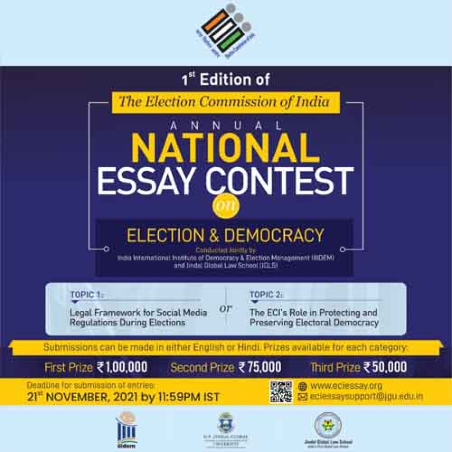 सोनीपत (हरियाणा)। निर्वाचन आयोग ने आज 'इंडिया इंटरनेशनल इंस्टीट्यूट ऑफ डेमोक्रेसी एंड इलेक्शन मैनेजमेंट' और जिंदल ग्लोबल लॉ स्कूल ओपी जिंदल ग्लोबल यूनिवर्सिटी सोनीपत की संयुक्त 'चुनाव और लोकतंत्र पर भारत निर्वाचन आयोग वार्षिक राष्ट्रीय निबंध प्रतियोगिता' का उद्घाटन संस्करण लॉंच किया। यह प्रतियोगिता कल 2 अक्टूबर 2021 से शुरु हो जाएगी, इसके लिए प्रविष्टियां जमा करने की अंतिम तिथि 21 नवम्बर 2021 है। प्रतियोगिता के दो विषय हैं-पहला विषय 'चुनावों के दौरान सामाजिक मीडिया विनियमों के लिए कानूनी ढांचा' और दूसरा विषय है-'चुनावी लोकतंत्र की रक्षा और संरक्षण में निर्वाचन आयोग की भूमिका'। निबंध प्रतियोगिता का मुख्य उद्देश्य कानून के छात्रों को समकालीन शोध में शामिल होने तथा भारत में चुनावों को नियंत्रित करने वाले कानूनों के नए आयामों की पड़ताल करने केलिए प्रोत्साहन देना है।