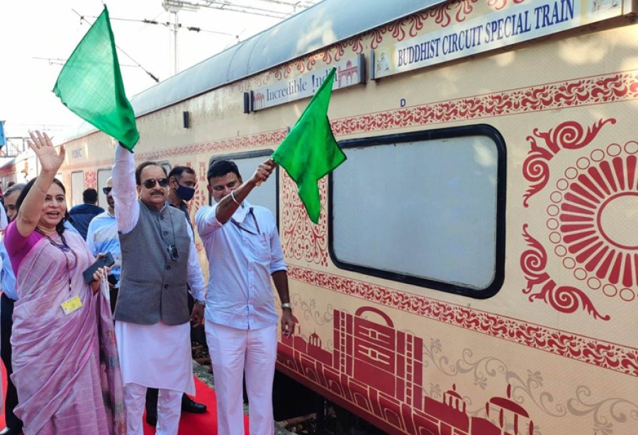 नई दिल्ली। पर्यटन राज्यमंत्री अजय भट्ट ने दिल्ली के सफदरजंग रेलवे स्टेशन से बौद्ध सर्किट विशेष ट्रेन को हरी झंडी दिखाई। बौद्ध पर्यटन में मौजूद संभावनाओं का लाभ उठाने केलिए पर्यटन मंत्रालय 4 से 8 अक्टूबर 2021 तक 'बुद्धिस्ट सर्किट ट्रेन फैम टूर एंड कॉंफ्रेंस' का आयोजन कर रहा है। पर्यटन राज्यमंत्री अजय भट्ट ने वैश्विक गंतव्यों से पहले भारतीय गंतव्यों की यात्रा करने के महत्व पर प्रकाश डाला। उन्होंने कहा कि हमारे पास बुद्धिस्ट सर्किट टूरिस्ट ट्रेन जैसी महान विरासत है, जो बिहार में गया (बोधगया), राजगीर (नालंदा) के साथ-साथ उत्तर प्रदेश में सारनाथ (वाराणसी) जैसे गंतव्यों को कवर करती है। उन्होंने देखो अपना देश अभियान की भावना को समाहित करते हुए घरेलू पर्यटन के महत्व पर ध्यान केंद्रित किया।