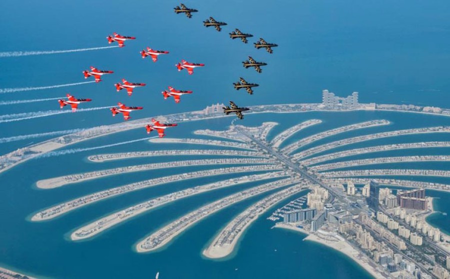 लड़ाकू विमानों ने दुबई के महत्वपूर्ण स्थलों पर उड़ान भरी