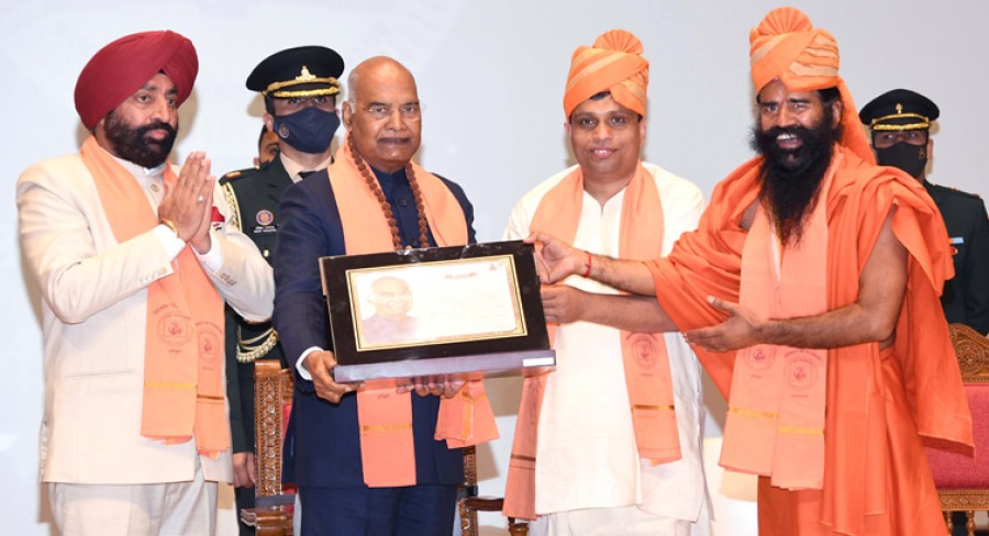 राष्ट्रपति रामनाथ कोविंद ने कहाकि उनकी मान्यता केअनुसार योग सबके लिए है, योग सबका है। राष्ट्रपति ने कहाकि आधुनिक चिकित्सा विज्ञान ने कई उपकरणों की मदद से उपचार के क्षेत्र में आश्चर्यजनक प्रगति की है, हालांकि आयुर्वेद और योग-विज्ञान ने ब्रह्मांड के विकसित सर्वोत्तम उपकरण यानी मानव शरीर पर गहराई से विचार और शोध किया है, शरीर के माध्यमसे ही इसने उपचार के प्रभावी तरीके विकसित किए हैं। उन्होंने कहाकि प्रकृति केसाथ मानव का सामंजस्यपूर्ण जुड़ाव ही आयुर्वेद और योग का लक्ष्य है तथा इस समरसता केलिए यह आवश्यक हैकि हम सभी प्रकृति के अनुसार जीवनशैली अपनाएं और प्राकृतिक नियमों का उल्लंघन न करें, प्राकृतिक उत्पादों का प्रयोग सभी केलिए लाभदायक होगा। राष्ट्रपति ने कहाकि पतंजलि विश्वविद्यालय स्वदेशी उद्यमशीलता और रोज़गार सृजन के विचार पर आधारित शिक्षा प्रदान करके भावी पीढ़ी को राष्ट्र निर्माण केलिए तैयार कर रहा है, उन्हें यह जानकर प्रसन्नता हुईकि पतंजलि ग्रुप ऑफ इंस्टीट्यूशंस में 'भारतीयता पर आधारित उद्यम' और 'उद्यम पर आधारित भारतीयता' विकसित हो रही है।