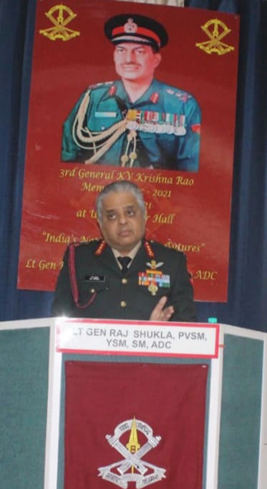 नई दिल्ली। जनरल केवी कृष्ण राव स्मृति व्याख्यान माला का तीसरा संस्करण भारतीय सेना की महार रेजिमेंट ने भारत के संयुक्त सेवा संस्थान यूनाइटेड सर्विसेज इंस्टीट्यूट-यूएसआई नई दिल्ली में आयोजित किया। इस अवसर पर सेना प्रशिक्षण कमान के जनरल ऑफिसर कमांडिंग इंचार्ज (जीओसी-इन-सी) लेफ्टिनेंट जनरल राज शुक्ला ने 'भारत के राष्ट्रीय सुरक्षा भविष्य’ पर प्रकाश डालते हुए आस-पड़ोस के देशों में पैर पसार रही सूचनात्मक युग प्रौद्योगिकियों से किए जा रहे युद्ध में तेजी से आते बदलाव पर ध्यान केंद्रित किया और राष्ट्रीय सुरक्षा में कमजोर पहलुओं केबारे में बताया एवं संभावित महत्वपूर्ण अंतरालों को दूर करने के उपायों पर भी विचार-विमर्श किया।