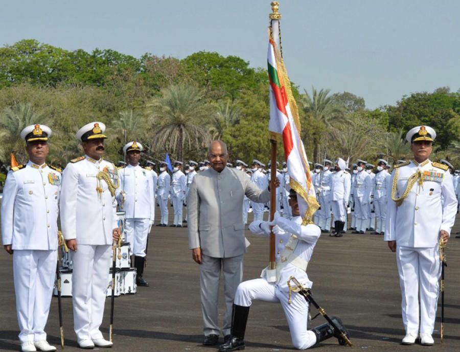 जामनगर (गुजरात)। राष्ट्रपति रामनाथ कोविंद ने आईएनएस वलसुरा को प्रतिष्ठित 'प्रेसिडेंटस कलर' प्रदान किया। 'निशान अधिकारी' लेफ्टिनेंट अरुण सिंह संब्याल ने एक प्रभावशाली परेड में अपनी यूनिट की ओरसे यह राष्ट्रपति निशान प्राप्त किया। गौरतलब हैकि शांति और युद्ध दोनों समय में राष्ट्र की असाधारण सेवा के सम्मान में किसी सैन्य इकाई को राष्ट्रपति निशान प्रदान किया जाता है। भारतीय नौसेना पहली भारतीय सशस्त्र सेना थी, जिसे 27 मई 1951 को डॉ राजेंद्र प्रसाद ने राष्ट्रपति निशान से सम्मानित किया था। औपचारिक परिधानों में अद्भुत दिख रहे आईएनएस वलसुरा के 800 से अधिक अधिकारियों और जवानों ने नौसेना बैंड की धुन पर गर्व केसाथ मार्च किया। आईएनएस वलसुरा यूनिट ने राष्ट्रपति केलिए 150 पुरुषों की गार्ड ऑफ ऑनर परेड प्रस्तुत की।