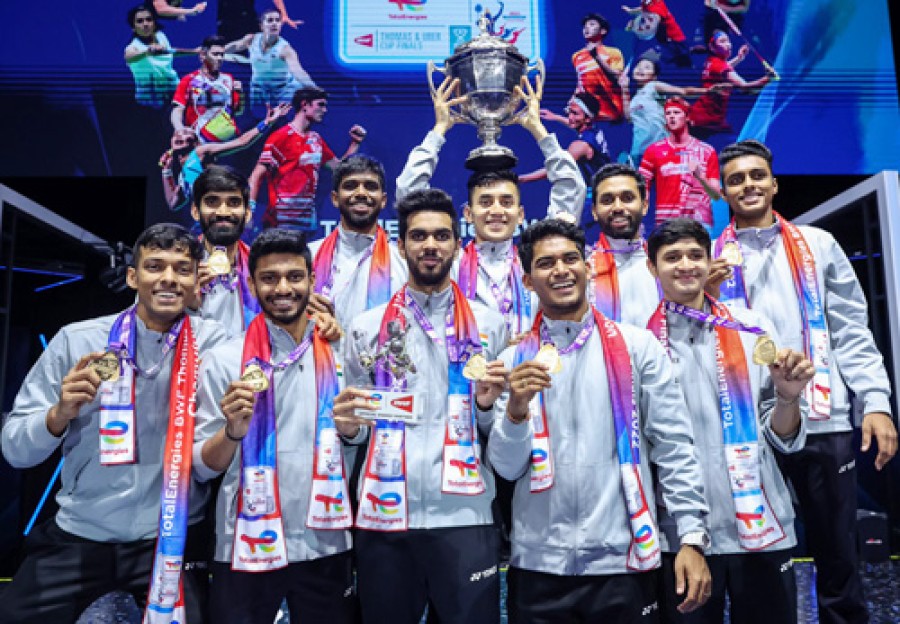 नई दिल्ली। भारतीय पुरुष बैडमिंटन टीम ने फाइनल में 14 बार की चैंपियन इंडोनेशिया को 3-0 से हराकर पहलीबार थॉमस कप का खिताब जीतकर इतिहास रच दिया है। थॉमस कप विश्व चैंपियनशिप के पदक विजेता लक्ष्य सेन, किदांबी श्रीकांत, चिराग शेट्टी और सात्विकसाईराज रंकीरेड्डी की विश्व की आठवें नंबर की युगल जोड़ी ने शानदार प्रदर्शन किया। प्रधानमंत्री नरेंद्र मोदी ने भारतीय पुरुष बैडमिंटन टीम को थॉमस कप जीतने पर बधाई दी है और एक ट्वीट में कहा हैकि भारतीय बैडमिंटन टीम ने इतिहास रच दिया है, थॉमस कप जीतने पर पूरा देश उत्साहित है! उन्होंने प्रतिभाशाली बैडमिंटन टीम को भविष्य के प्रयासों केलिए भी शुभकामनाएं दीं। प्रधानमंत्री ने कहाकि बैडमिंटन टीम की यह जीत कई उभरते हुए खिलाड़ियों को प्रेरित करेगी। प्रधानमंत्री ने भारतीय बैडमिंटन टीम से फोन पर भी बातचीत की और कहाकि खेल विश्लेषकों को इसे भारत को खेलों में मिली बेहतरीन जीत कहना पड़ेगा। उन्होंने कहाकि उन्हें इस बातकी बेहद खुशी हैकि टीम एक भी राउंड नहीं हारी।