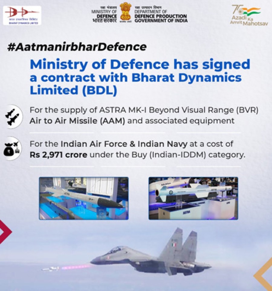 नई दिल्ली। रक्षा मंत्रालय ने आत्मनिर्भर भारत के विज़न को बढ़ावा देते हुए भारतीय वायुसेना और नौसेना केलिए खरीदे श्रेणी केतहत 2,971 करोड़ रुपये की लागत से एस्ट्रा एमके-आई बियॉन्ड विजुअल रेंज एयर टू एयर मिसाइल और संबंधित उपकरण की आपूर्ति केलिए भारत डायनेमिक्स लिमिटेड यानी बीडीएल केसाथ एक अनुबंध पर हस्ताक्षर किए हैं। अभीतक इस श्रेणी की मिसाइल को स्वदेशी रूपसे बनाने की तकनीक उपलब्ध नहीं थी। एस्ट्रा एमके-आई बीवीआर एएएम को रक्षा अनुसंधान और विकास संगठन ने स्वदेशी रूपसे डिजाइन और विकसित किया है, जो विदेशी स्रोतों पर निर्भरता कम करते हुए बियॉन्ड विजुअल रेंज केसाथ-साथ क्लोज कॉम्बैट एंगेजमेंट केलिए भारतीय वायुसेना की जारी की गई स्टाफ आवश्यकताओं पर आधारित है।
