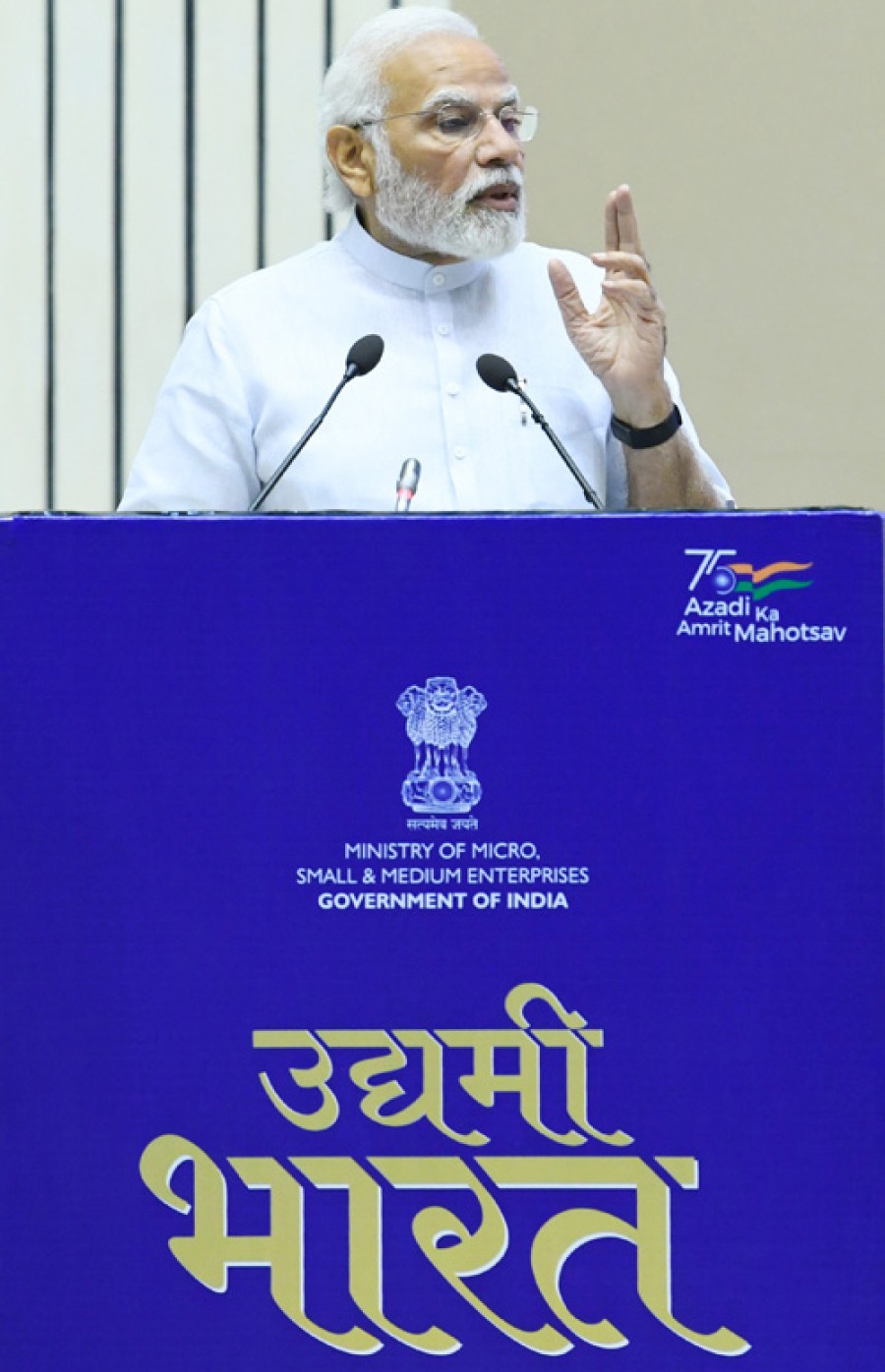 नरेंद्र मोदी ने कहाकि उद्यम पोर्टल पर पंजीकृत लोगों में से 18 प्रतिशत से अधिक महिला उद्यमी हैं, उद्यमशीलता और आर्थिक समावेशन में यह समावेश सही मायने में सामाजिक न्याय है। प्रधानमंत्री ने कहाकि आज इस कार्यक्रम के माध्यम से मैं एमएसएमई क्षेत्र से जुड़े अपने सभी भाइयों और बहनों को आश्वस्त करता हूंकि सरकार ऐसी नीतियां बनाने केलिए प्रतिबद्ध है, जो आपकी आवश्यकताओं को पूरा करती हैं और आपके लिए सकारात्मक हो। उन्होंने कहाकि एक उद्यमी भारत की हर उपलब्धि हमें आत्मनिर्भर भारत की ओर ले जाएगी। उन्होंने कहाकि उद्यमी भारत एमएसएमई के सशक्तिकरण केलिए सरकार की प्रतिबद्धता को दर्शाता है, सरकार ने समय-समय पर एमएसएमई क्षेत्र को आवश्यक और समय पर सहायता प्रदान करने केलिए मुद्रा योजना, आपातकालीन क्रेडिट लाइन गारंटी योजना, पारंपरिक उद्योगों के उत्थान केलिए कोष योजना आदि कई पहलों की शुरुआत की है, जिससे देशभर में करोड़ों लोगों को लाभ हुआ है। कार्यक्रम में केंद्रीय मंत्री नारायण राणे और भानुप्रताप सिंह वर्मा, देशभर के एमएसएमई हितधारक और विभिन्न देशों के राजनयिक उपस्थित थे।