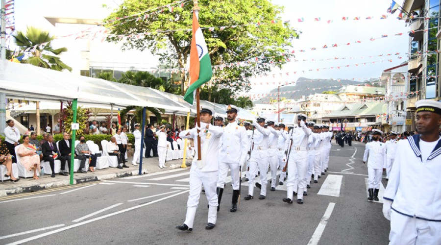 पोर्ट विक्टोरिया। भारतीय नौसेना की टुकड़ी ने सेशेल्स गणराज्य के स्वाधीनता दिवस समारोह में सहभागिता केलिए सेशेल्स रक्षा बल के उत्साही कर्मियों और गौरवांवित नागरिकों केसाथ हिस्सा लिया। गौरतलब हैकि भारतीय नौसेना का स्वदेशी पोत आईएनएस कोलकाता, जोकि स्टील्थ गाइडेड मिसाइल डिस्ट्रॉयर जहाज है, उसे 29 जून 2022 को सेशेल्स के स्वतंत्रता दिवस पर सेशेल्स के पोर्ट विक्टोरिया में तैनात किया गया था और इस महत्वपूर्ण अवसर को अधिक यादगार बनाने केलिए आईएनएस कोलकाता को शानदार तरीके से तैयार किया गया था। रोश काइमन के यूनिटी स्टेडियम में 3 जुलाई 2022 को सैन्य परेड में भारतीय नौसेना के जवानों की एक मार्चिंग टुकड़ी संगीत बैंड केसाथ शामिल हुई। आईएनएस कोलकाता की तैनाती ने वर्ष 1976 से सेशेल्स के राष्ट्रीय दिवस में भारतीय सैन्य दल की निरंतर भागीदारी को और भी विशिष्ट बना दिया।