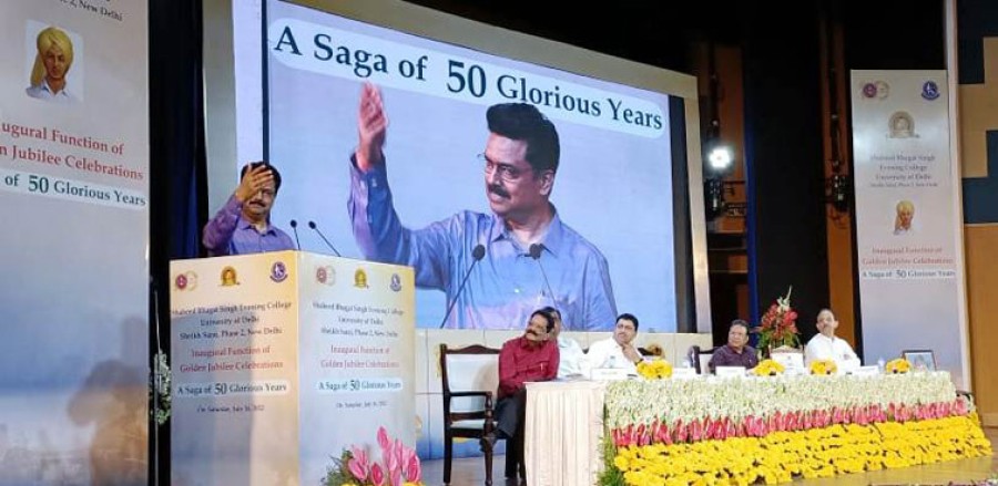 नई दिल्ली। दिल्ली विश्वविद्यालय के शहीद भगत सिंह सांध्य महाविद्यालय ने अपने स्थापना के 50 वर्ष पूर्ण होने पर 'ए सागा ऑफ 50 ग्लोरियस इयर्स' आयोजित किया। डॉ भीमराव अंबेडकर अंतर्राष्ट्रीय केंद्र में हुए इस कार्यक्रम का दिल्ली विश्वविद्यालय के उपकुलपति प्रोफेसर योगेश सिंह, दिल्ली विश्वविद्यालय के डीन ऑफ कॉलेज प्रोफेसर बलराम पाणि और दक्षिणी परिसर के निदेशक प्रोफेसर प्रकाश सिंह ने दीप जलाकर शुभारंभ किया। समारोह में अथितियों ने 'Momentous Moments' शीर्षक से कॉफी-टेबल का भी अनावरण किया, जिसमें कॉलेज से जुड़ी गतिविधियां और 50 वर्ष के इतिहास का संक्षिप्त प्रस्तुतिकरण किया गया है।