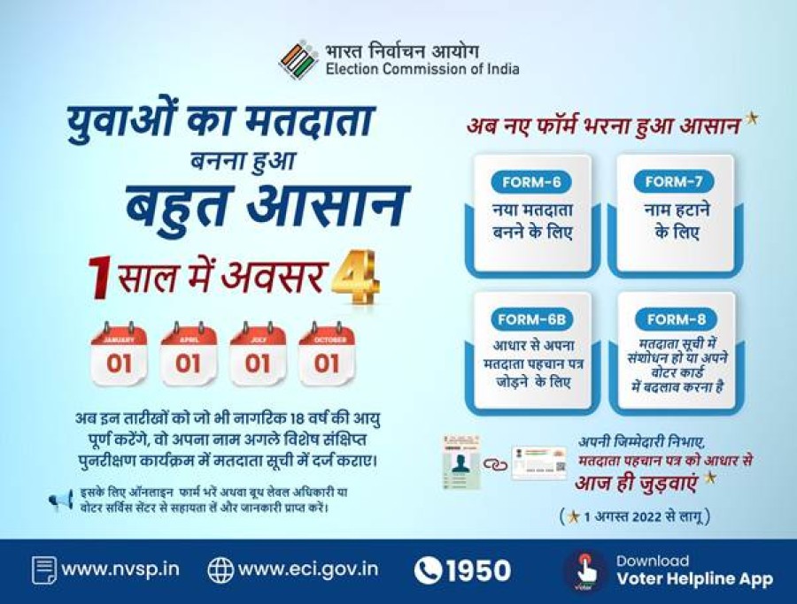 नई दिल्ली। भारत निर्वाचन आयोग ने एक महत्वपूर्ण निर्णय में 17+ वर्ष के युवाओं को भी मतदाता सूची में अपना नाम दर्ज कराने केलिए अग्रिम रूपसे आवेदन करने का अवसर दे दिया है। युवाओं को इसके लिए किसी वर्ष की 1 जनवरी को 18 वर्ष की आयु प्राप्त करने के पूर्वापेक्षित मानदंड की प्रतीक्षा करने की आवश्यकता नहीं होगी। मुख्य निर्वाचन आयुक्त राजीव कुमार और निर्वाचन आयुक्त अनूपचंद्र पांडेय ने निर्वाचन आयोग के सभी राज्यों के मुख्य निर्वाचन अधिकारियों, निर्वाचक रजिस्ट्रीकरण अधिकारियों एवं सहायक निर्वाचक रजिस्ट्रीकरण अधिकारियों को इस तरह के प्रौद्योगिकी-सक्षम समाधान तैयार करने के निर्देश दिए हैं, ताकि युवाओं को न केवल 1 जनवरी, बल्कि तीन पश्चातवर्ती अर्हक तिथियों अर्थात 1 अप्रैल, 1 जुलाई और 1 अक्टूबर के संदर्भ में भी अपने अग्रिम आवेदन दाखिल करने की सुविधा मिल सके। बीएलओ को पूरी तरह निगरानी में रखा गया है। उसके आवेदन प्रारूपों की सूची भी इस घोषणा के साथ प्रस्तुत करेगा कि उसने आवेदन प्रारूपों के विवरणों का व्यक्तिगत रूपसे सत्यापन कर लिया है और उसका यह समाधान हो गया है कि वे सही हैं।