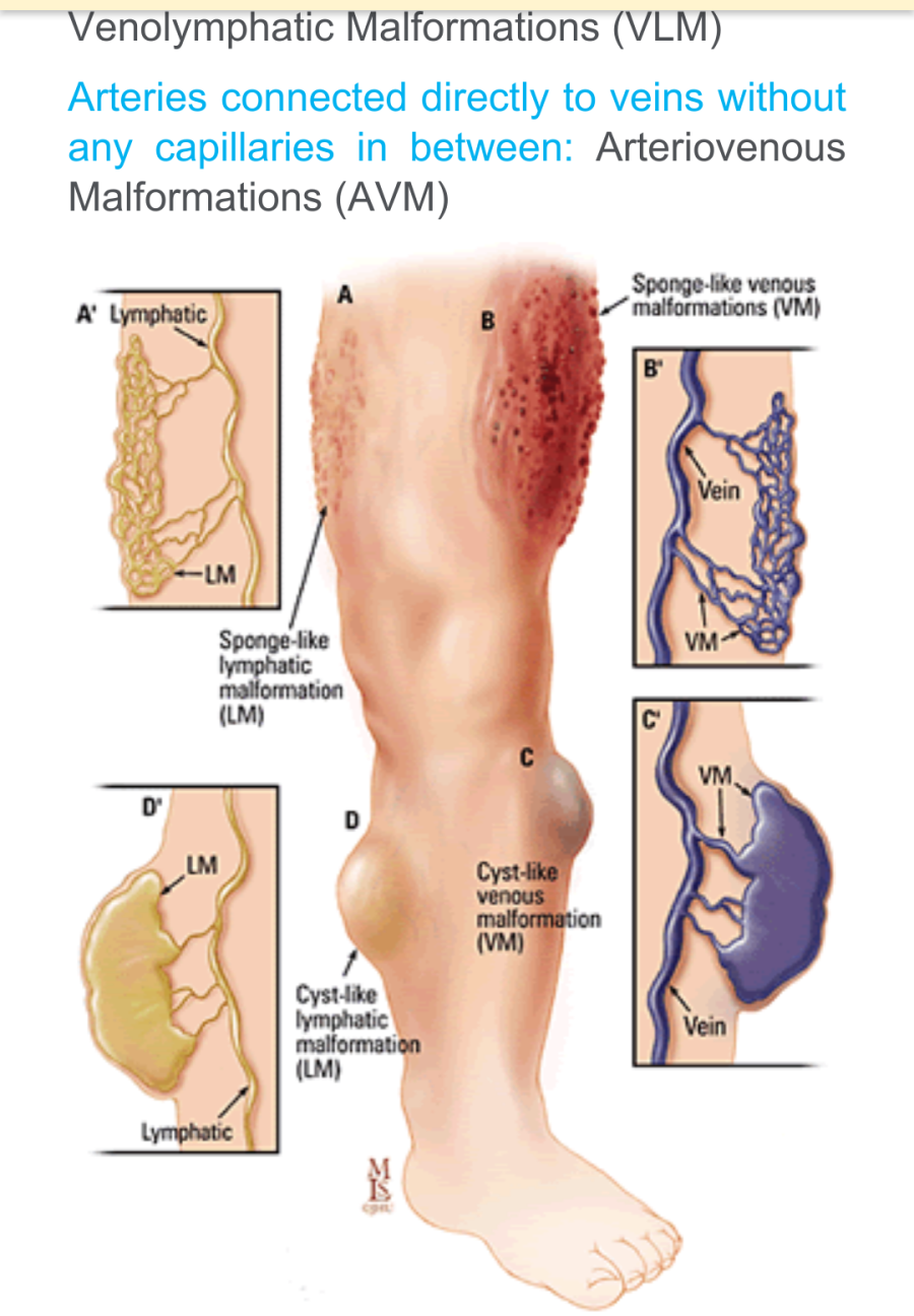 शिरापरक और लसिका संबंधी विकृतियां त्वचा के नीचे एक गांठ का कारण बन सकती हैं। त्वचा पर एक अंतर्निहित जन्मचिन्ह हो सकता है। त्वचा के घावों से रक्तस्राव या लसिका द्रव का रिसाव हो सकता है। लिम्फैटिक विकृतियां संक्रमित हो जाती हैं, जिन्हें बार-बार एंटीबायोटिक उपचार की आवश्यकता होती है। शिरापरक और लसीका संबंधी विकृतियां क्लिपेल-ट्रेनायुन सिंड्रोम नामक एक सिंड्रोम से जुड़ी हो सकती हैं। धमनी विस्फार विकृतियां (एवीएम) दर्द का कारण बन सकती हैं। धमनियों से शिराओं तक रक्त के तेजी से शंटिंग होने के कारण वे हृदय पर भी अधिक तनावपूर्ण होती हैं। उनके स्थान के आधार पर उनका परिणाम रक्तस्राव भी हो सकता है।