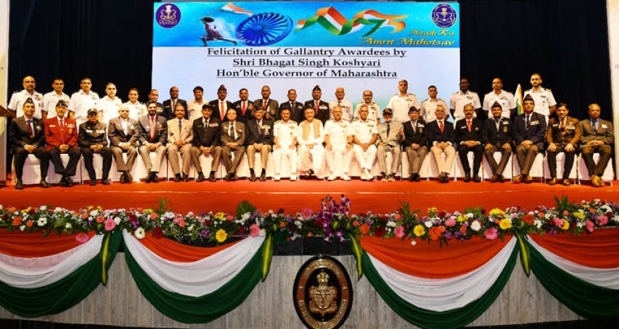 मुंबई। पश्चिमी नौसेना कमान ने आज़ादी के अमृत महोत्सव समारोह के अंतर्गत मुल्ला सभागार मुंबई में एक समारोह में भारतीय नौसेना के सेवारत और सेवानिवृत्त वीरता पुरस्कार प्राप्तकर्ताओं को सम्मानित किया। समारोह में मुख्य अतिथि महाराष्ट्र के राज्यपाल भगतसिंह कोश्यारी थे और पश्चिमी नौसेना कमान के फ्लैग ऑफिसर कमांडिंग-इन-चीफ वाइस एडमिरल अजेंद्र बहादुर सिंह ने उनका स्वागत किया। राज्यपाल ने तीन वीरचक्र, पांच शौर्यचक्र और 30 नौसेना पदक (वीरता) पुरस्कार प्राप्तकर्ताओं को सम्मानित किया। सम्मानित होने वालों में 13 सेवानिवृत्त अधिकारी और आठ सेवानिवृत्त नाविक शामिल थे।