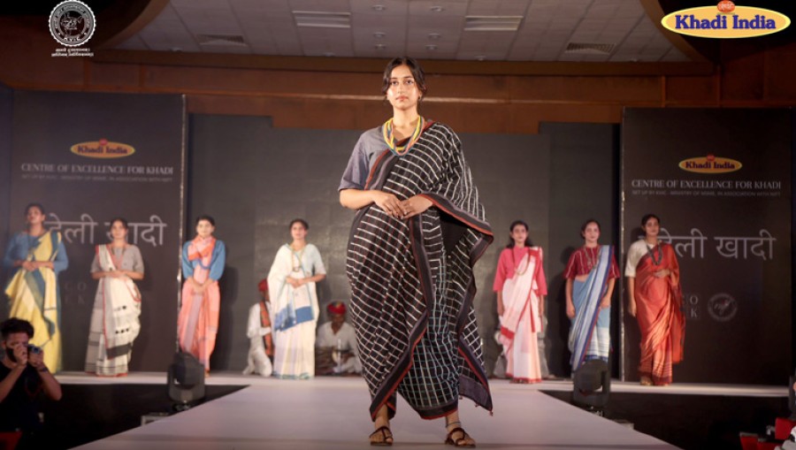 गांधीनगर। 'राष्ट्र केलिए खादी, परिवर्तन केलिए खादी' यह अब सिर्फ एक वाक्य नहीं, बल्कि एक हकीकत बन चुका है। प्रधानमंत्री नरेंद्र मोदी के अथक प्रयासों के कारणही खादी एक लोकप्रिय वैश्विक ब्रांड के रूपमें उभर रही है एवं अपनी बढ़ती लोकप्रियता से युवाओं में गहरी छाप भी छोड़ रही है। प्रधानमंत्री नरेंद्र मोदी के खादी को एक फैशन फैब्रिक के रूपमें स्थापित करने के आह्वान को पूरा करना खादी और ग्रामोद्योग आयोग का मुख्य उद्देश्य है। सभी केलिए और खासकर हमारे समाज के युवाओं केलिए खादी को बढ़ावा देने का प्रधानमंत्री का निरंतर प्रयास रहा है। खादी इंडिया ने युवा दर्शकों और वैश्विक बाजार तक पहुंचने के इरादे से प्रदर्शनी और खादी को एक कपड़े के रूपमें लोकप्रिय बनाने तथा पारंपरिक एवं समकालीन फैशन में इसके उपयोग को प्रदर्शित करने केलिए निफ्ट गांधीनगर के टाना रीरी ऑडिटोरियम में 'अहेली खादी' फैशन शो आयोजित किया था। इसमें केवीआईसी के अध्यक्ष मनोज गोयल मुख्य अतिथि थे और प्रतिष्ठित डिजाइनरों, फैशन उद्योग के सदस्यों, छात्रों और खादी संस्थानों ने भी इसकी शोभा बढ़ाई।