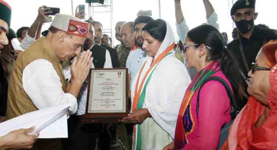 शिमला। रक्षामंत्री राजनाथ सिंह ने आज राष्ट्र की सेवामें अपने प्राणों की आहुति देनेवाले हिमाचल प्रदेश के सशस्त्रबलों के शहीद जवानों के परिजनों को सम्मानित किया है। हिमाचल के कांगड़ा जिले के बाडोली गांव में सम्मान कार्यक्रम आयोजित किया गया। रक्षामंत्री ने परमवीरचक्र से सम्मानित मेजर सोमनाथ शर्मा (1947), महावीरचक्र से सम्मानित ब्रिगेडियर शेरजंग थापा (1948), परमवीरचक्र से सम्मानित लेफ्टिनेंट कर्नल धनसिंह थापा (1962), परमवीरचक्र से सम्मानित कैप्टन विक्रम बत्रा (1999) और सूबेदार मेजर संजय कुमार (1999) सहित उन सभी युद्ध नायकों को भावभीनी श्रद्धांजलि अर्पित की, जिनका नाम उनकी बेजोड़ बहादुरी और बलिदान केलिए हर भारतीय के दिल में अंकित है। राजनाथ सिंह ने युद्धवीरों के परिजनों के सम्मान में कहाकि देश शहीदों के बलिदान का सदैव ऋणी रहेगा। उन्होंने कहाकि सशस्त्रबल हमेशा युवाओं केलिए प्रेरणास्रोत रहेंगे, क्योंकि उनमें अनुशासन, कर्तव्य, समर्पण, देशभक्ति और बलिदान के गुण हैं और वे राष्ट्रीय गौरव एवं विश्वास के प्रतीक हैं।