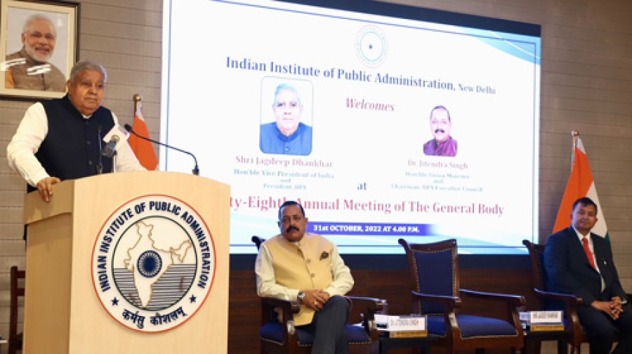 उपराष्ट्रपति जगदीप धनखड़ ने कहाकि प्रधानमंत्री नरेंद्र मोदी का 'सबका साथ सबका विकास सबका विश्वास सबका प्रयास' आह्वान भारतीय सभ्यता की प्रकृति और भारतीय संविधान निर्माताओं के दृष्टिकोण को अपनेमें समाहित करता है। उन्होंने नौकरशाहों से कहाकि वह इस दृष्टिकोण को यथार्थ बनाएं और सरकार के विकासशील दृष्टिकोण को अंतिमव्यक्ति तक पहुंचाने केलिए काम करें। जगदीप धनखड़ ने लोकसेवकों से कहाकि वे अपने कर्तव्यों का निर्वहन करते समय सत्तारूढ़ राजनीतिक व्यवस्था की चिंता न करें, बल्कि संवैधानिक नियमों और कर्तव्यों का पालन करें। उन्होंने कहाकि प्रणालीगत भ्रष्टाचार की विनाशकारी प्रवृत्ति को नौकरशाही, नागरिक समाज और व्यापक स्तरपर लोगों द्वारा ही पूर्ण रूपसे समाप्त किया जा सकता है। केंद्रीय मंत्री और आईआईपीए के चेयरमैन डॉ जितेंद्र सिंह भी आमसभा में मौजूद थे। उन्होंने कहाकि नौकरशाह भविष्य में वृद्ध जनसंख्या, आय की बढ़ती असमानता और जलवायु न्याय जैसी तिहरी समस्याओं से निपटने केलिए तैयार रहें।