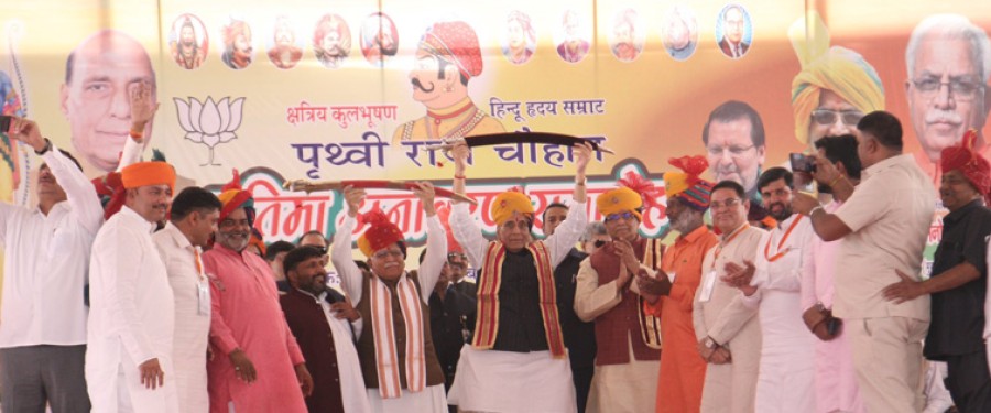 रक्षामंत्री राजनाथ सिंह ने कहाकि औपनिवेशिक मानसिकता से छुटकारा पाने केलिए नरेंद्र मोदी सरकार ने राजपथ का नाम बदलकर कर्तव्यपथ करने, इंडिया गेट परिसर में नेताजी सुभाषचंद्र बोस की भव्य प्रतिमा की स्थापना, मराठायोद्धा छत्रपति शिवाजी से प्रेरित नया भारतीय नौसेना का पताका भारत के युद्ध पोतों पर अब सेंट जार्ज का क्रास नहीं भारतीय नौसेना के जनक छत्रपति शिवाजी महाराज की मुहर से प्रेरित निशान लगाया जा रहा है और लगभग 1,500 अप्रचलित ब्रिटिश युग के कानूनों को समाप्त करने सहित कई पहलें की हैं। उन्होंने कहाकि हमें इस बात पर हर्ष और गर्व होना चाहिएकि इस समय देशमें नरेंद्र मोदी सरकार ने इस देशकी आकांक्षाओं को समझा है और सांस्कृतिक विरासत कोभी सम्मान दिया है। रक्षामंत्री ने कहाकि सम्राट पृथ्वीराज चौहान की गिनती भारतवर्ष के उन महान शासकों में होती है, जिन्होंने केवल एक बड़े भूभाग परही राज नहीं किया, बल्कि अपने शौर्य, पराक्रम, न्यायप्रियता और जनकल्याण के चलते जनता के दिलों परभी राज करने में कामयाबी हासिल की। इस अवसर पर हरियाणा के मुख्यमंत्री मनोहरलाल खट्टर और गणमान्य नागरिक उपस्थित थे।
