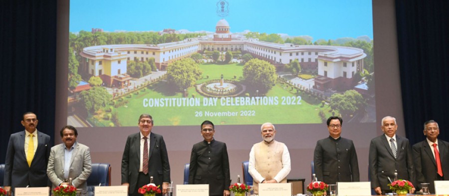 प्रधानमंत्री नरेंद्र मोदी ने कहाकि जनहितैषी नीतियों की ताकत से देश और देश का ग़रीब का सशक्तिकरण हो रहा है, सामान्य मानवी केलिए क़ानूनों को सरल बनाया जा रहा है। उन्होंने कहाकि समयोचित न्याय केलिए हमारा न्यायतंत्र भी लगातार कई सार्थक कदम उठा रहा है, सुप्रीम कोर्ट ने ई-पहल की शुरूआत की है, मैं इसके लिए और 'न्याय में आसानी' के प्रयासों केलिए सभी को बधाई देता हूं। प्रधानमंत्री ने कहाकि इसबार 15 अगस्त को लालकिले से मैंने कर्तव्यों पर बल दिया था, ये हमारे संविधान कीही भावना का प्रकटीकरण है। उन्होंने कहाकि महात्मा गांधी कहते थेकि-‘हमारे अधिकार हमारे वो कर्तव्य हैं, जिन्हें हम सच्ची अखंडता और समर्पण केसाथ पूरा करते हैं’। उन्होंने कहाकि अमृतकाल में जब हम आज़ादी के 75 वर्ष पूर्ण करके अगले 25 वर्ष की यात्रा शुरू कर रहे हैं तो संविधान का ये मंत्र देश केलिए एक संकल्प बन रहा है। प्रधानमंत्री ने कहाकि आज़ादी का अमृतकाल देश केलिए कर्तव्यकाल है, चाहे व्यक्ति हों या संस्थाएं हमारे दायित्व ही आज हमारी पहली प्राथमिकता हैं, भारत के सामने नित नए अवसर बन रहे हैं और वह हर चुनौती को पार करते हुए बढ़ रहा है। उन्होंने कहाकि एक सप्ताह केबाद भारत को जी20 की प्रेसीडेंसी भी मिलने वाली है, ये बहुत बड़ा अवसर है, हम सभी टीम इंडिया के रूपमें विश्व में भारत की प्रतिष्ठा को बढ़ाएं, भारत का योगदान विश्व के सामने लेकर जाएं, येभी हम सभीका सामूहिक दायित्व है।