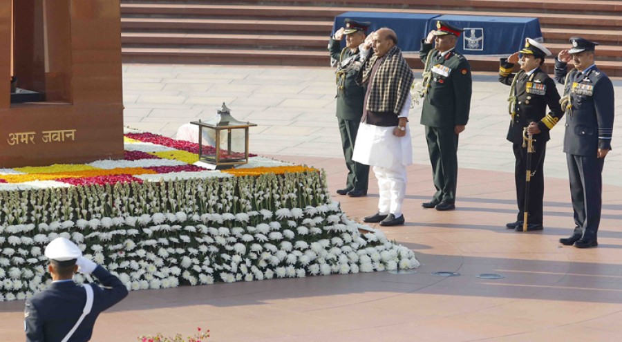 नई दिल्ली। रक्षामंत्री राजनाथ सिंह ने विजय दिवस पर कल नई दिल्ली में राष्ट्रीय युद्ध स्मारक पर जाकर पुष्पांजलि अर्पित की। रक्षामंत्री ने आगंतुक पुस्तिका में अपने संदेश में लिखाकि राष्ट्र उन बहादुरों का ऋणी रहेगा, जिन्होंने राष्ट्र की संप्रभुता की रक्षा करते हुए सर्वोच्च बलिदान दिया है और हम उनके आदर्शों और मूल्यों केसाथ विकास की राह पर आगे बढ़ते रहेंगे। इससे पहले रक्षामंत्री राजनाथ सिंह ने एक ट्वीट में 1971 के युद्ध को अमानवीयता पर मानवता की जीत, दुराचार पर सदाचार और अन्याय पर न्याय की जीत बताया था।