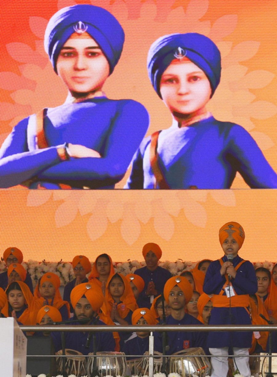 प्रधानमंत्री नरेंद्र मोदी ने कहाकि एक ओर धार्मिक कट्टरता और उस कट्टरता में अंधी मुगल सल्तनत, दूसरी ओर ज्ञान और तपस्या में तपे हुए हमारे गुरु, भारत के प्राचीन मानवीय मूल्यों को जीनेवाली परंपरा, एक ओर आतंक की पराकाष्ठा तो दूसरी ओर आध्यात्म का शीर्ष, एक ओर मजहबी उन्माद तो दूसरी ओर सबमें ईश्वर देखने वाली उदारता और इस सबके बीच एक ओर लाखों की फौज और दूसरी ओर अकेले होकरभी निडर खड़े गुरु के वीर साहिबजादे! प्रधानमंत्री ने कहाकि वीर साहिबजादे किसी धमकी से डरे नहीं, किसी के सामने झुके नहीं, जोरावर सिंह साहब और फतेह सिंह साहब को दीवार में जिंदा चुनवा दिया गया, एक ओर नृशंसता ने अपनी सभी सीमाएं तोड़ दीं तो दूसरी ओर धैर्य शौर्य एवं पराक्रम केभी सभी प्रतिमान टूट गए, साहिबजादा अजीत सिंह और साहिबजादा जुझार सिंह ने बहादुरी की वो मिसाल कायम की, जो सदियों को प्रेरणा दे रही है। प्रधानमंत्री ने कहाकि अगर हमें भारत को भविष्य में सफलता के शिखरों तक लेकर जाना है तो हमें अतीत के संकुचित नजरियों से भी आज़ाद होना पड़ेगा, इसीलिए आजादी के अमृतकाल में देश ने गुलामी की मानसिकता से मुक्ति का प्राण फूंका है और वीर बाल दिवस देश के उन पंच प्राणों केलिए प्राणवायु की तरह है।